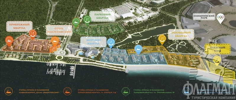 Гостиничный комплекс «Имеретинский» предлагает комфортабельные апартаменты "Прибрежного", "Морского", "Заповедного" , "Паркового" кварталов и отель ИМЕРЕТИНСКИЙ 4*, которые подойдут как для длительного проживания, так и для отдыха на выходные. В период проведения Зимних Олимпийских Игр на территории "Заповедного", "Паркового" и "Морского" кварталов размещалась Олимпийская деревня. В Морском, Заповедном, Парковом кварталах все апартаменты с кухнями. Только в Прибрежном есть апартаменты как с кухней, так и без кухни. Рядом с отелем располагается крупнейшая на побережье марина на 700 стояночных мест для яхт.