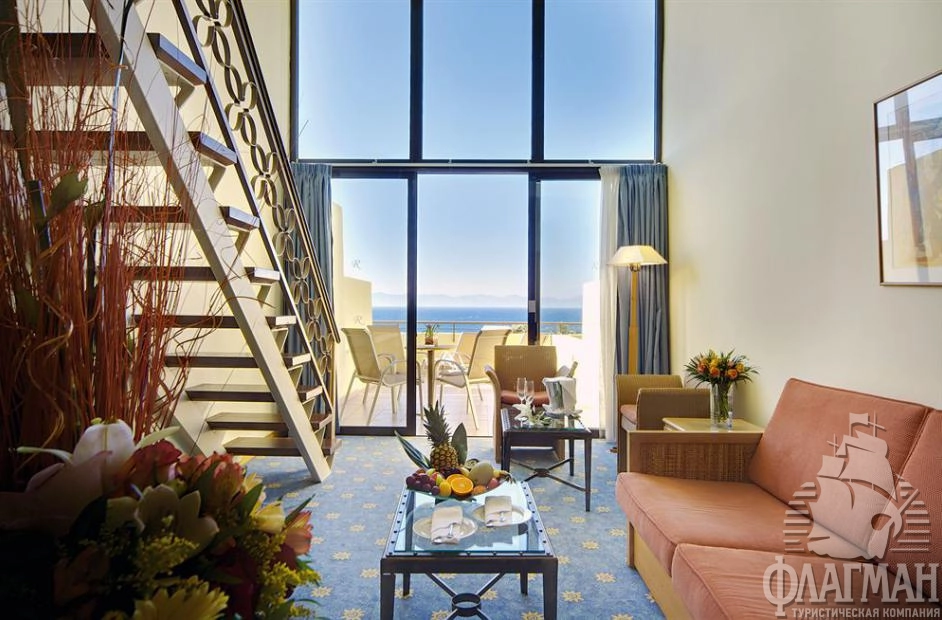 - family suite SV (вид на море, двухуровневый номер, 1 этаж: гостиная, ванная комната с душем, 2 этаж: спальня, ванная комната с ванной, осн. кровать – двуспальная (2 односпальные по запросу), доп. – раскладной диван, раскладная кровать, макс. 3+1 чел., 51 м2),