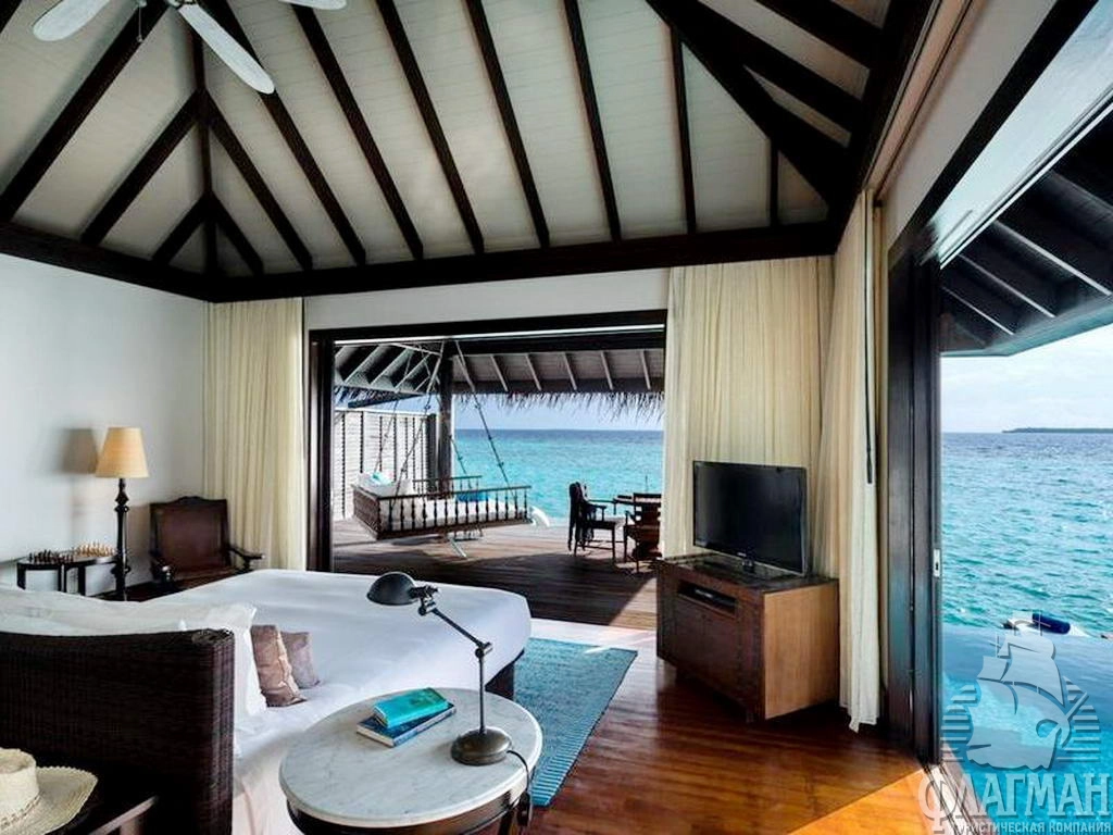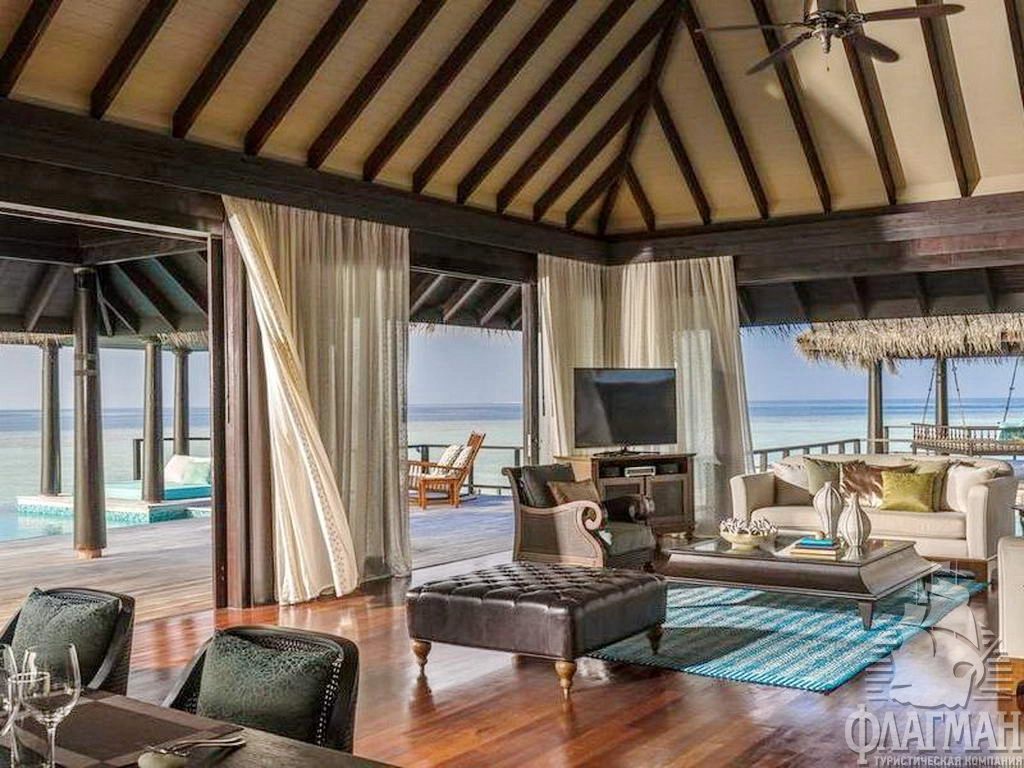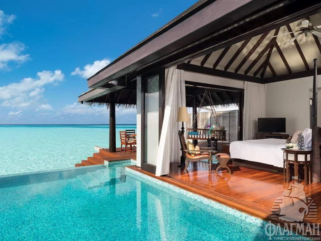 2 Two Bedroom Over Water Pool Residence (861 м², макс. 6 или 4+4 чел.). Водные бунгало c двумя спальнями, отдельной гостиной. Тахта на террасе с прямым спуском в воду, надводный обеденный павильон со стеклянной панелью в полу, частично открытая ванная комната, частный бассейн, услуги личного батлера.