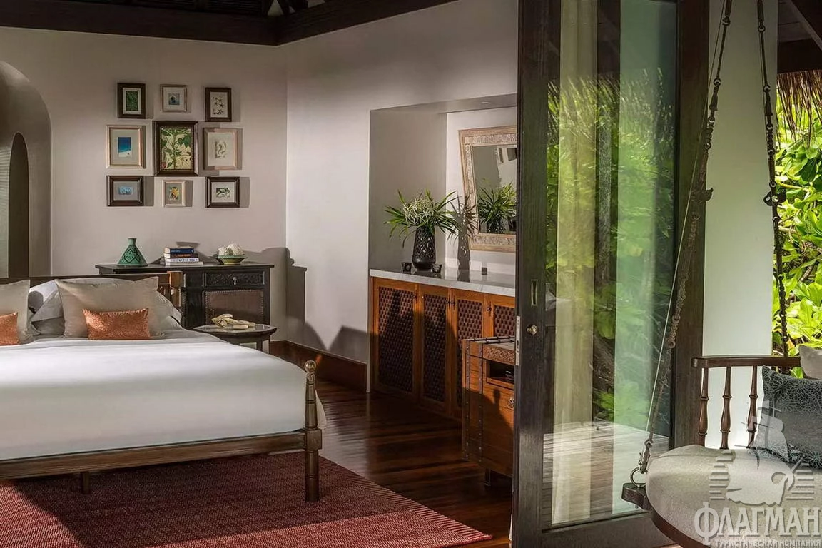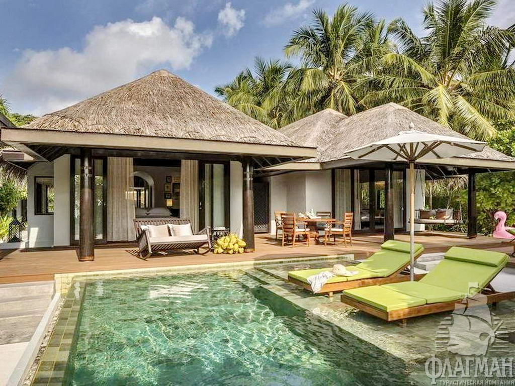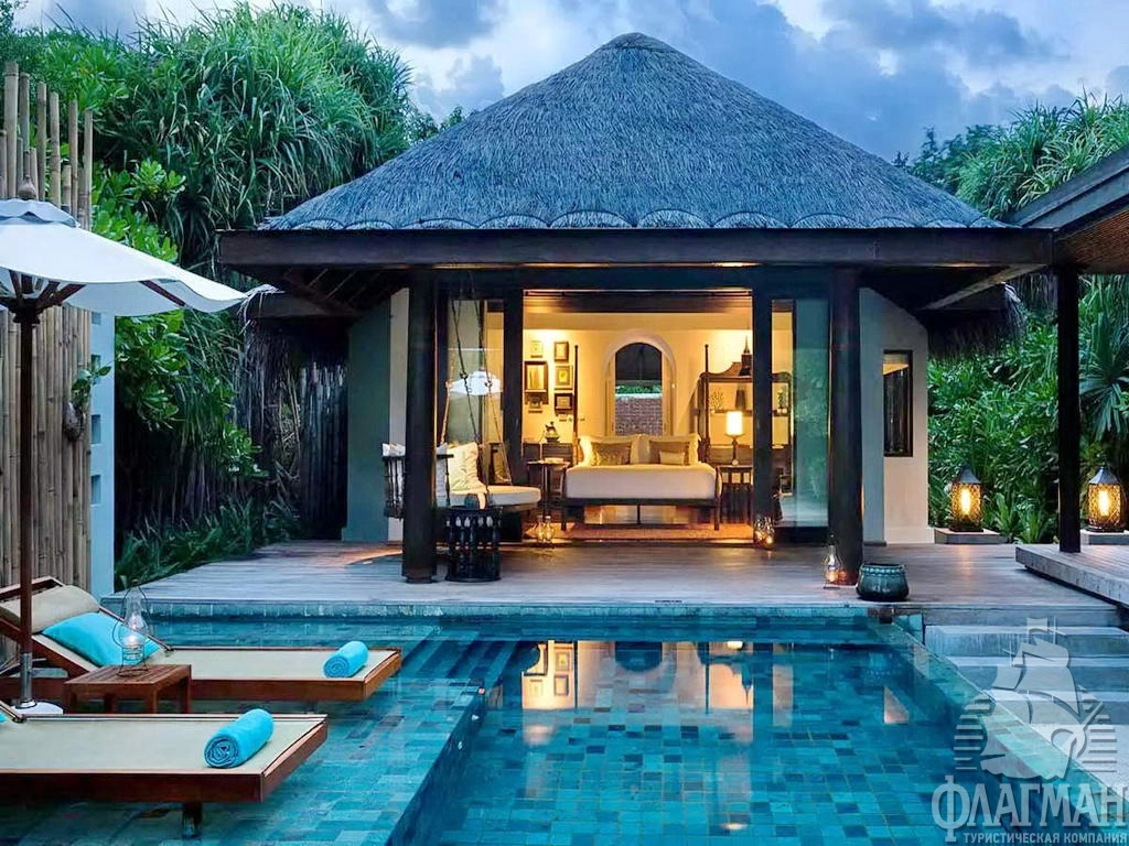 2 Two Bedroom Beach Pool Residence (785 м², макс. 6 или 4 + 4 чел.). Береговая вилла c двумя спальнями, двумя ванными комнатами, отдельной гостиной. Качели, частный бассейн, мини-кухня, душ под открытым небом, частично открытая ванная комната с ванной для двоих, услуги личного батлера.