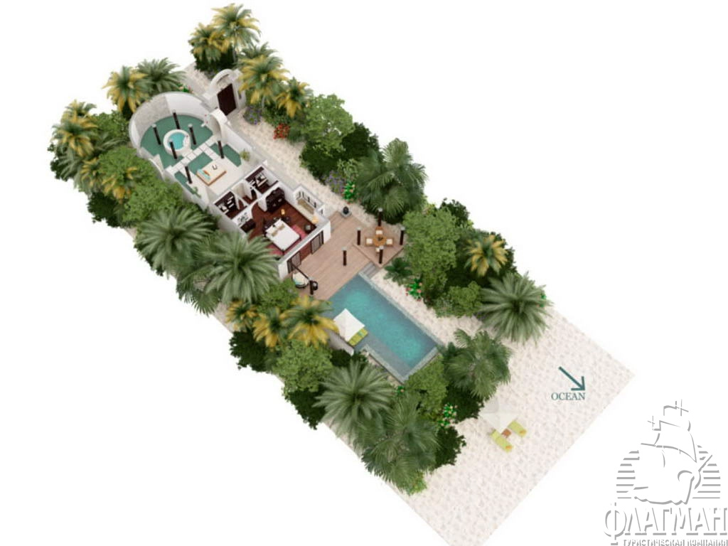 1 Four Bedroom Beach Pool Residence (2994 м2 (общая площадь всей территории вместе с крытыми помещениями и зонами на открытом воздухе), макс. 8+4 чел.) Идентичны по наполнению категории Three Bedroom Beach Pool Residence), но имеют 4 спальни.