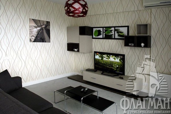 - Апартаменты с 1 спальней улучшенные. Апартаменты. Площадь (кв. м) - 56 кв.м. В номере: зеркало, кресло, двуспальная кровать, раскладной диван, стол, стулья, шкаф, кондиционер, микроволновая печь, набор посуды, стиральная машина, телевизор ЖК, холодильник, электрическая плита, электрочайник.