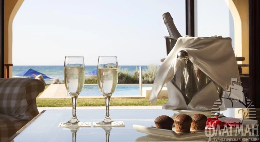 - цветы, фрукты, вино, игристое вино, бутылка воды, традиционные греческие сладости и критская раки в номере по прибытии (фрукты и вода обновляются каждые 2 дня)