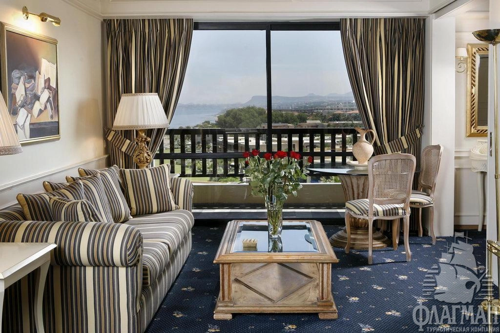 - Royal pavilion private pool (вид на морe, двухуровневый номер: 1 этаж – гостиная и столовая зона с мини-баром, спальня с мраморной ванной, 2 этаж – спальня с зоной гостиной, балконом и мраморной ванной с джакузи; основная кровать – двуспальная, доп. – 2 односпальные, частный вход и внутренний дворик, терраса с шезлонгами, зонтами и индивидуальным бассейном, макс. 4 чел., 220 м2).