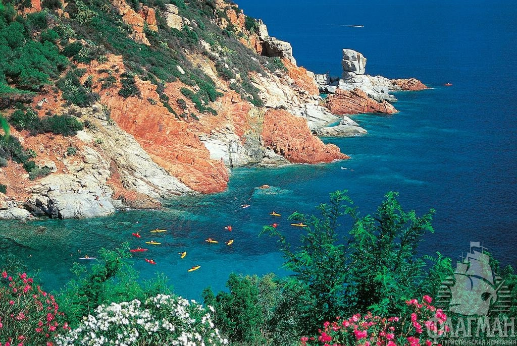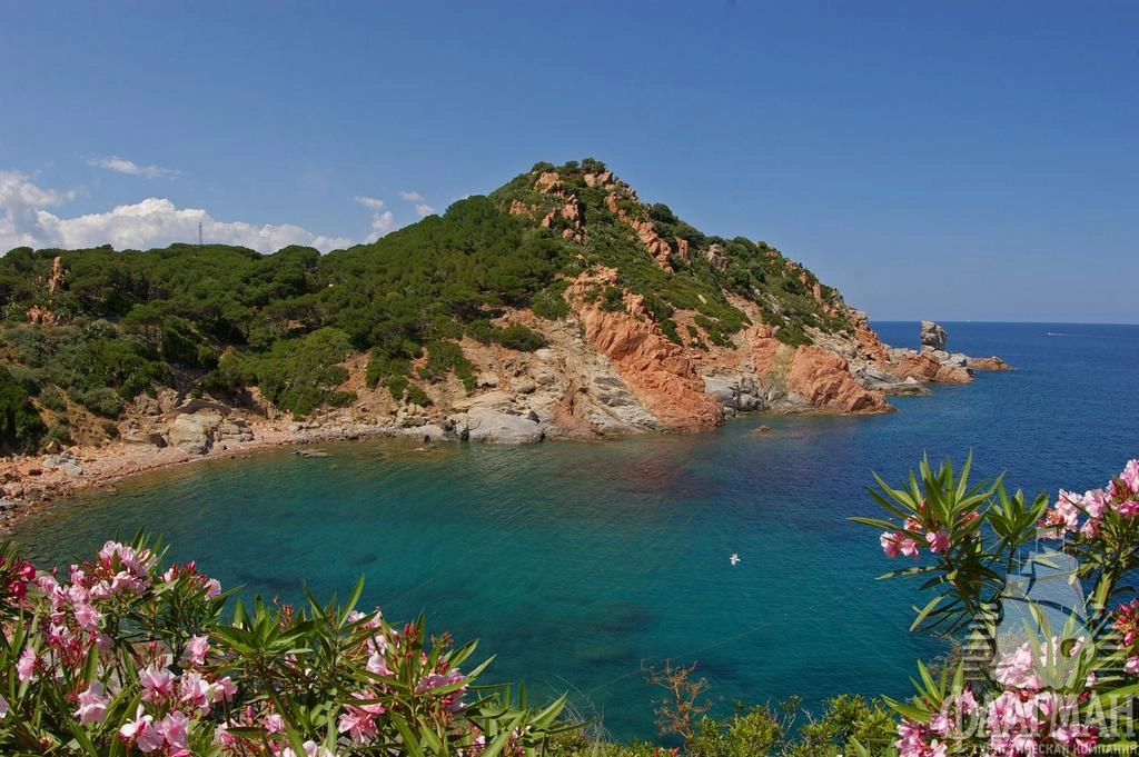 - среди скал в бухте Cala Moresca, где песчаные террасы спускаются к морю