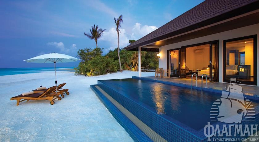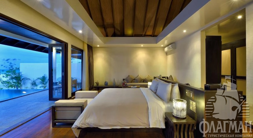 10 Sunset Pool Villa (192 м2, макс. 2+2 или 3+1 чел.). Роскошные виллы, расположенные в северной части острова, с прямым выходом на пляж. Спальня с кроватью queen, зона отдыха с диваном, письменный стол, гардеробная зона, веранда с частным бассейном (30 м²) и лежаками. Ванная комната частично на открытом воздухе. Сheck-in в номере; приветственный напиток (шампанское) и канапе в вилле по заезду; ежедневно – корзина фруктов в номере, 1 бутылка красного и 1 бутылка белого вина. 2 дополнительные бутылки алкогольных напитков (на выбор, по меню Platinum Plus Alcohol Menu). Услуги батлера, услуги электромобиля багги (по вызову). По желанию – завтраки (до 09:30) и ужины в a la carte в ресторане Sunset (бесплатно). Бесплатная аренда велосипедов.