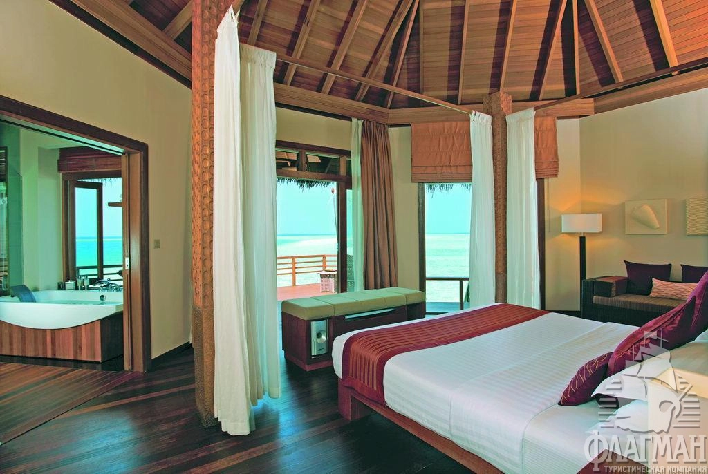 15 Water Villa (92 м2, макс. 3 чел.). Отдельно стоящие водные бунгало: спальня с кроватью king-size, зона гостиной, ванная комната с видом на океан, меблированная терраса с прямым спуском в воду.
