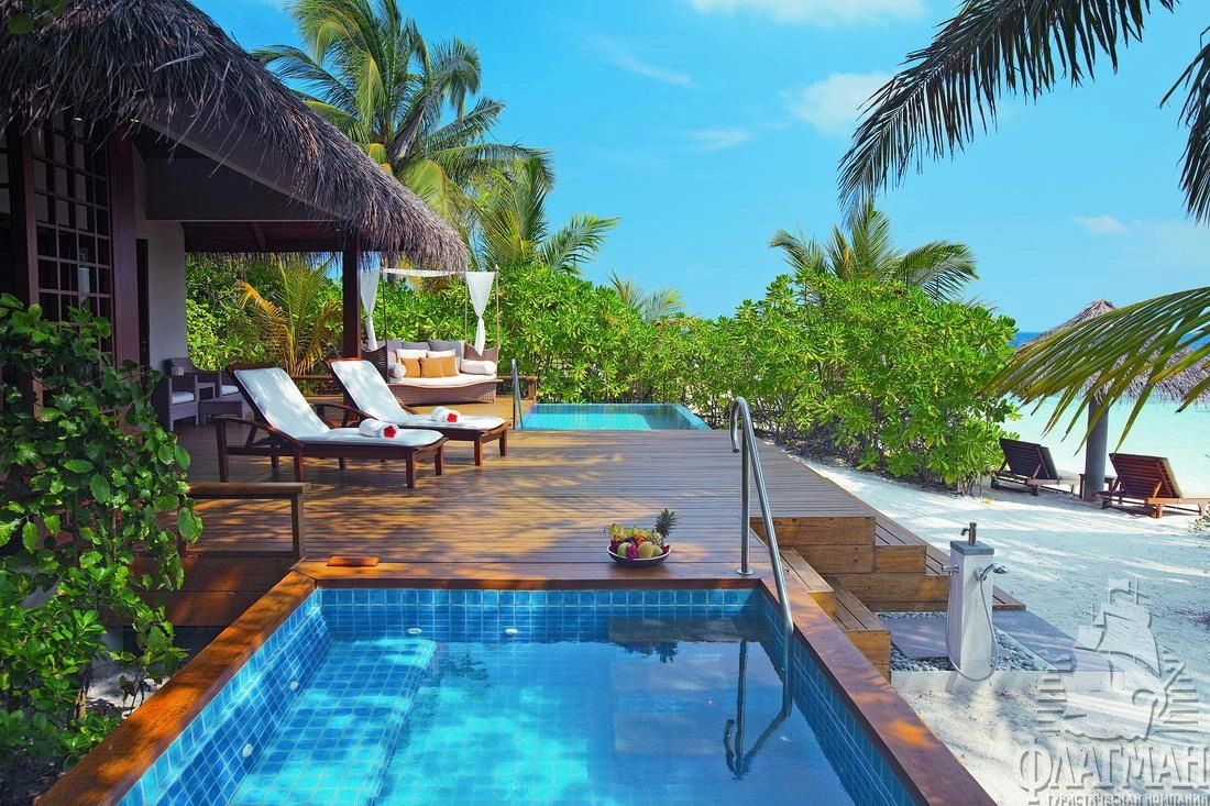 2 Baros Premium Pool Villa (160 м2, макс. 3 или 2+1 чел.). Отдельно стоящие просторные виллы на берегу: спальня с кроватью king-size, небольшой частный бассейн-каскад (3,4x2,4 м) и джакузи для двоих (1,7х1,7 м), собственный участок пляжа с шезлонгами, большая открытая деревянная терраса с тахтой для двоих и обеденным столом.