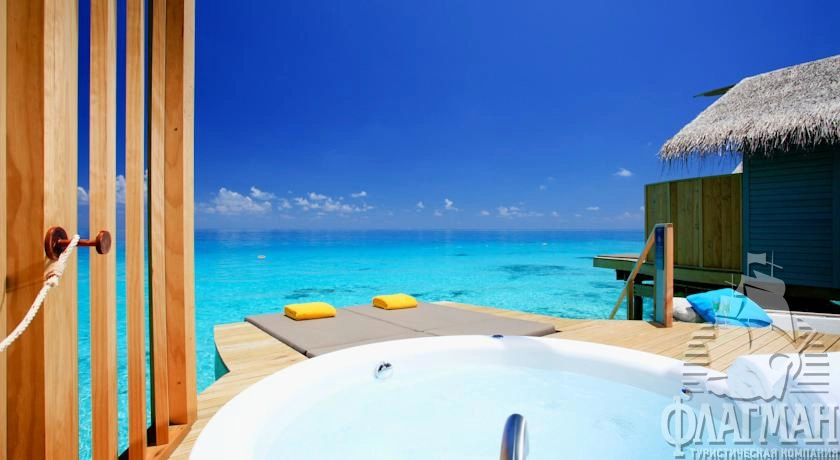 10 Deluxe Spa Over Water Villa (42 м2, макс. 2 чел). Водные виллы с видом на восход. Кровать king-size, терраса со SPA-ванной и шезлонгами. Прямой спуск в океан. Бесплатное оборудование для снорклинга.