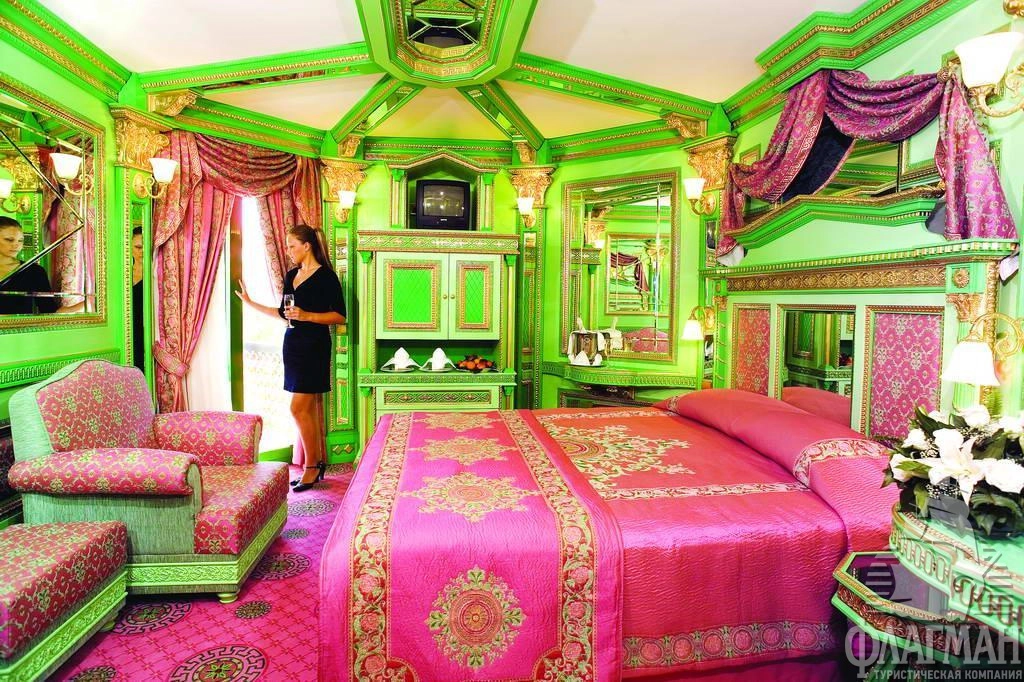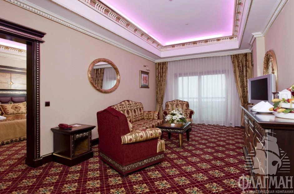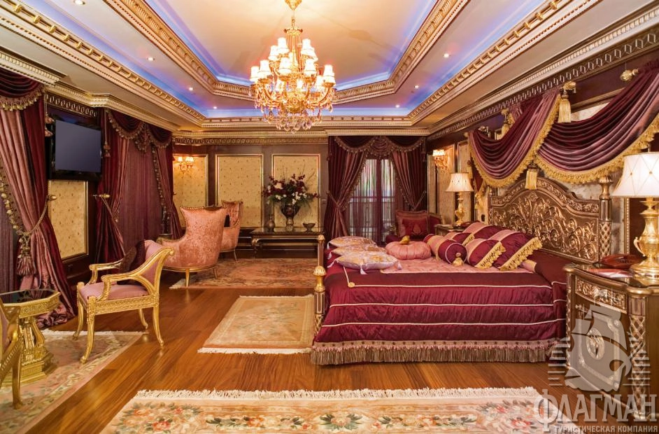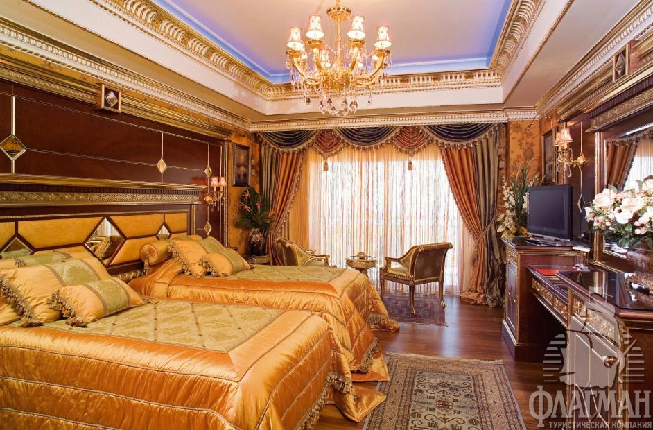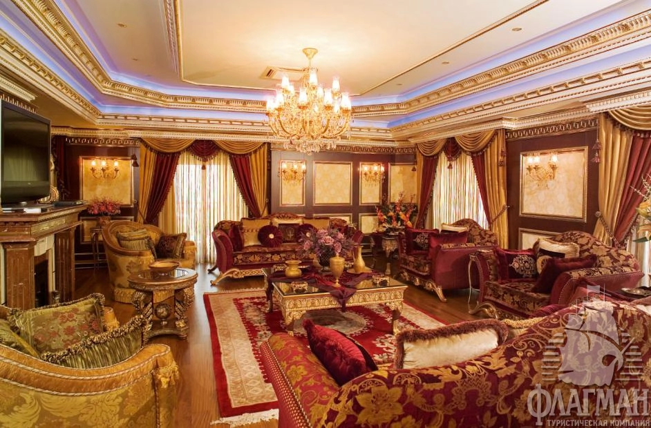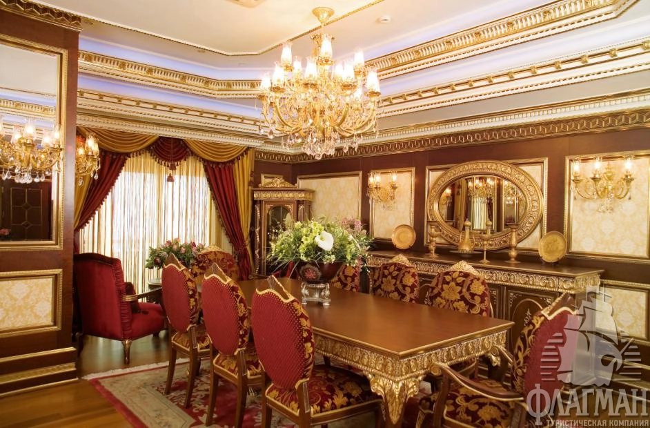 1 трехкомнатный ottoman palace (гостиная с обеденным столом и небольшим баром, мини-кухня, 2 спальни c дверью, гардеробная комната, рабочий кабинет, багажная комната, 2 ванные: одна из них с джакузи, 3 террасы, макс. 4 чел., 450 м2).