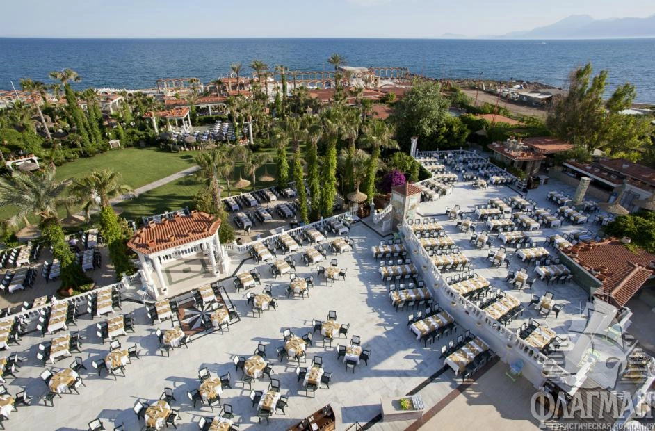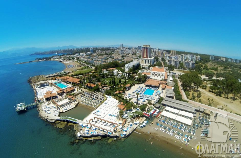 Расположен в 9 км от аэропорта, в 12 км от центра г. Анталья, на берегу моря.