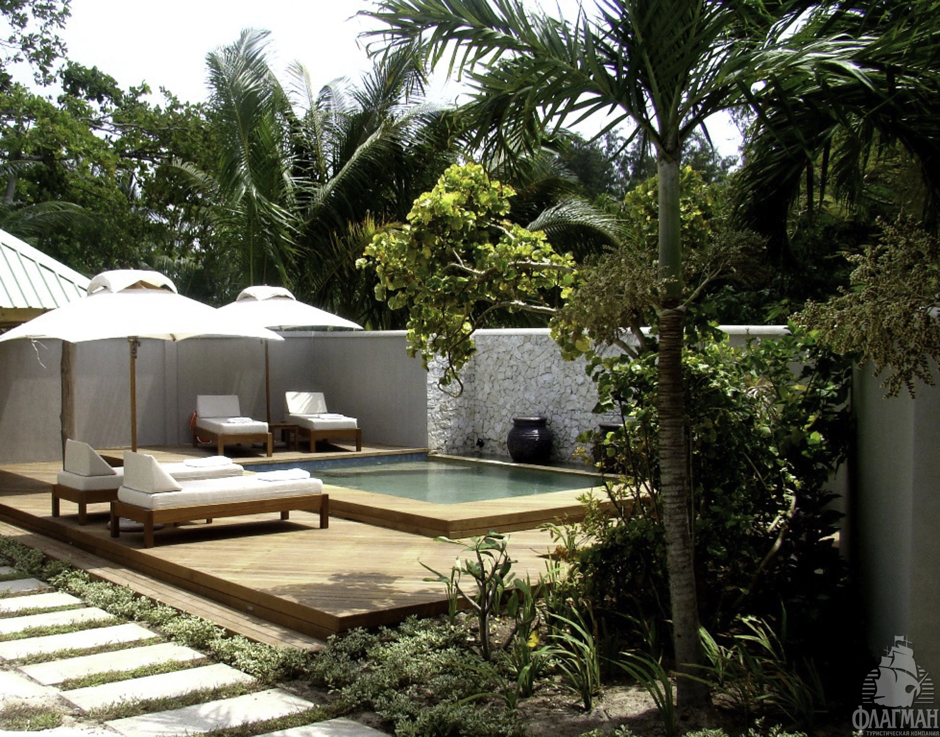 - 10 Deluxe Beach Cottage (130 м², макс. 2+2 реб. (0-12 лет) или 2+1 (0-18 лет)). Береговые виллы с прямым видом на океан. Спальня с кроватью king-size, зона гостиной, ванная комната на открытом воздухе с ванной и душем, частный мини-садик, терраса, зона отдыха на открытом воздухе, беседка, шезлонги на пляже.