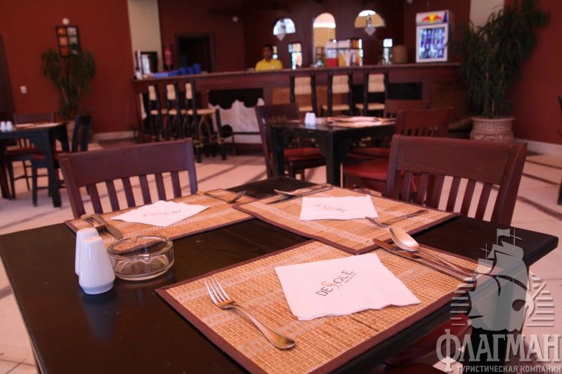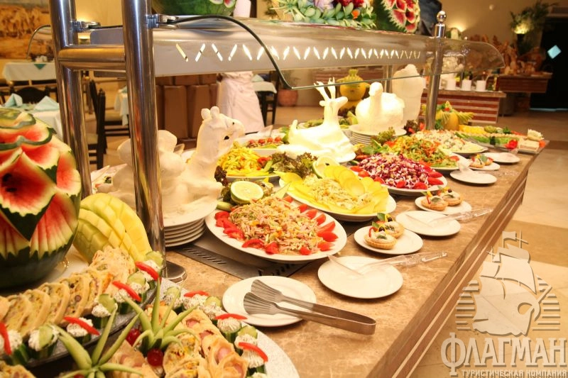 - основной ресторан El Khaima: шведский стол; завтрак с 07:00-10:00, поздний завтрак с 10:00-11:00, обед с 13:00-15:00, ужин с 19:00-21:30.
