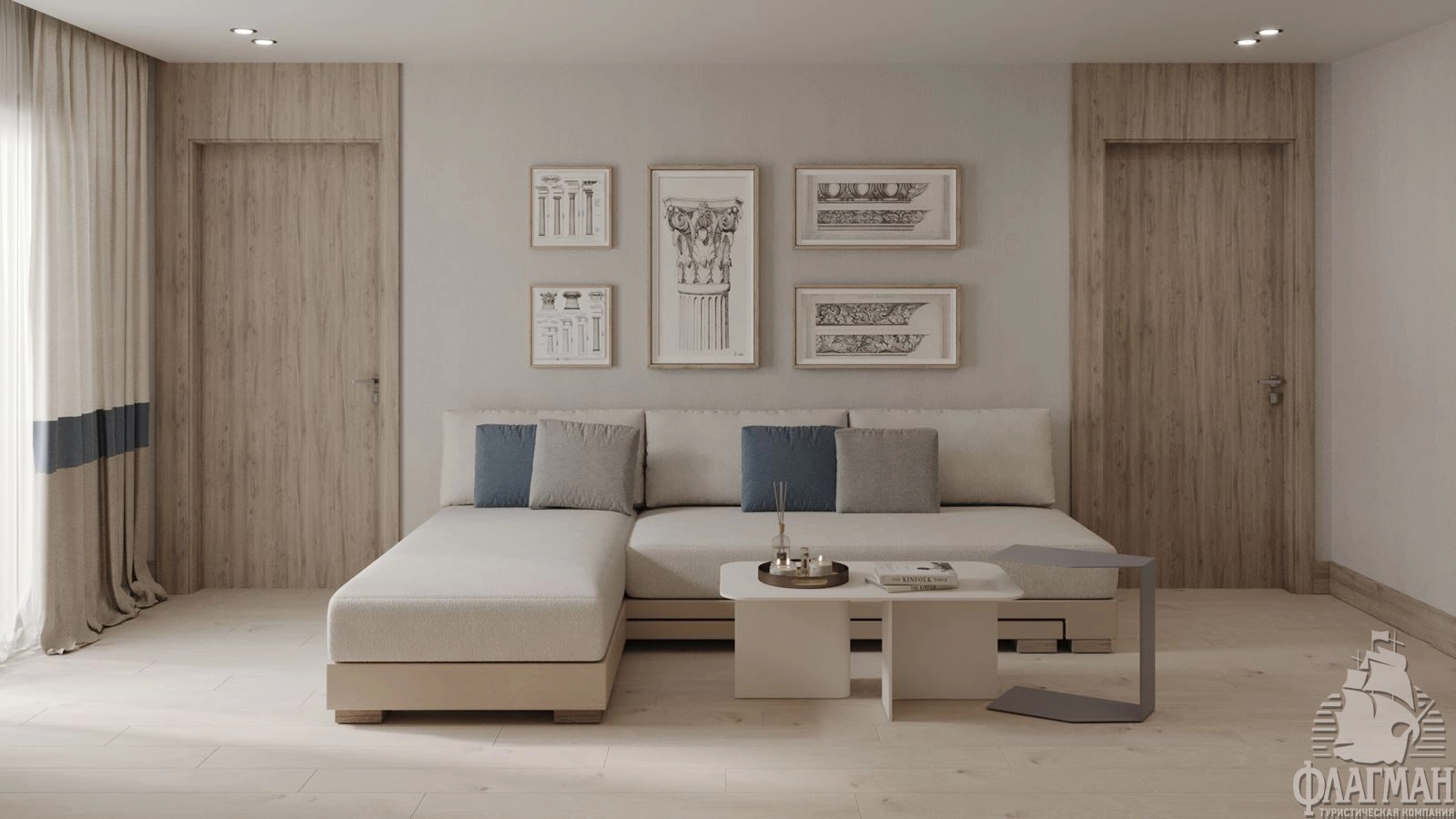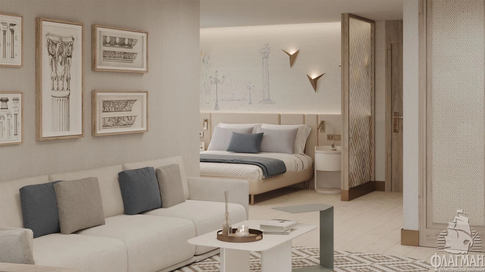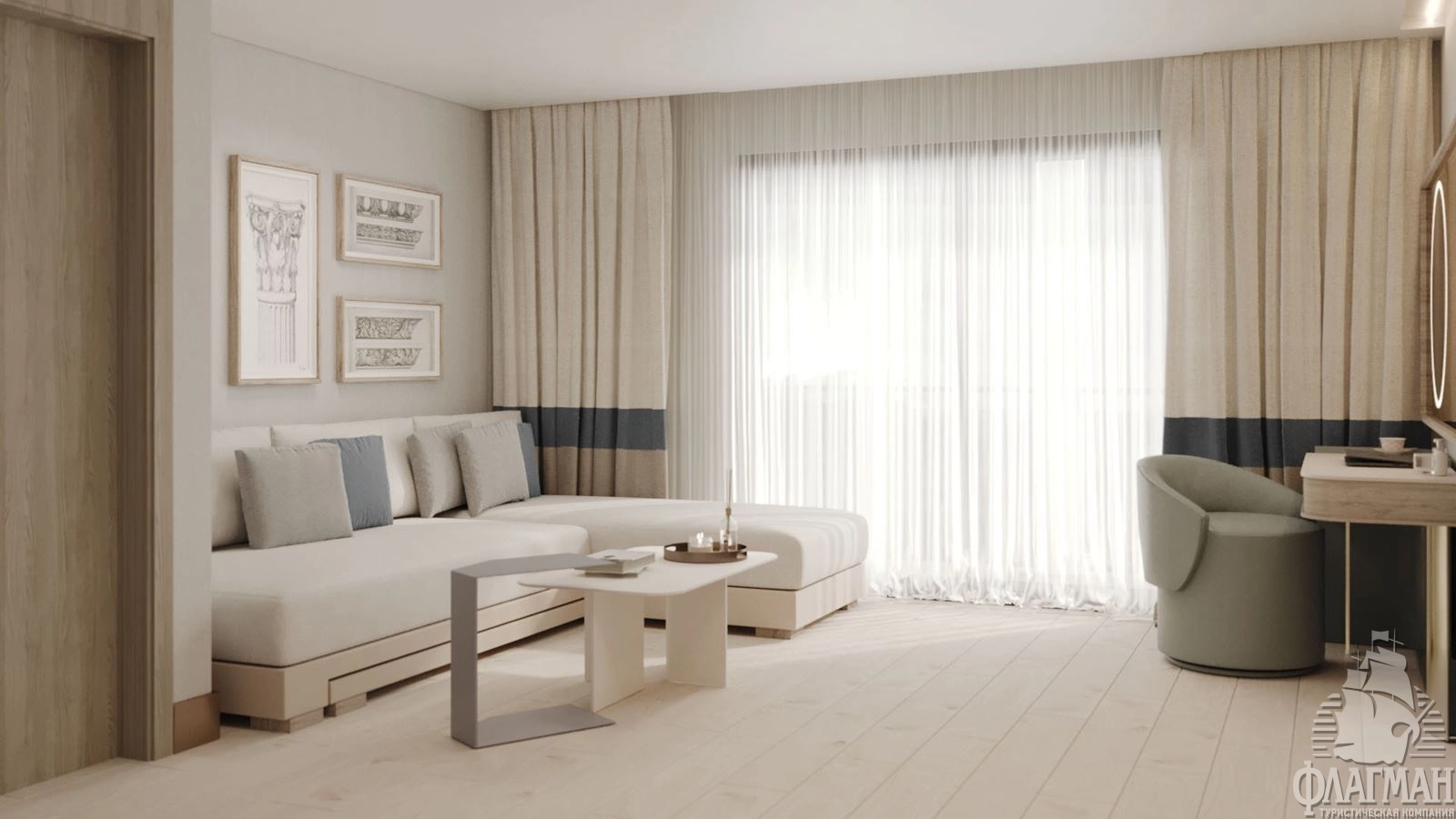 - Corner suite - номер: 60 кв.м, 2 спальни и гостиная с дверью (двуспальная кровать и софа), кухня, 2 ванные комнаты, балкон, частичный вид на море/вид на сад/бассейн, макс. 6 чел.