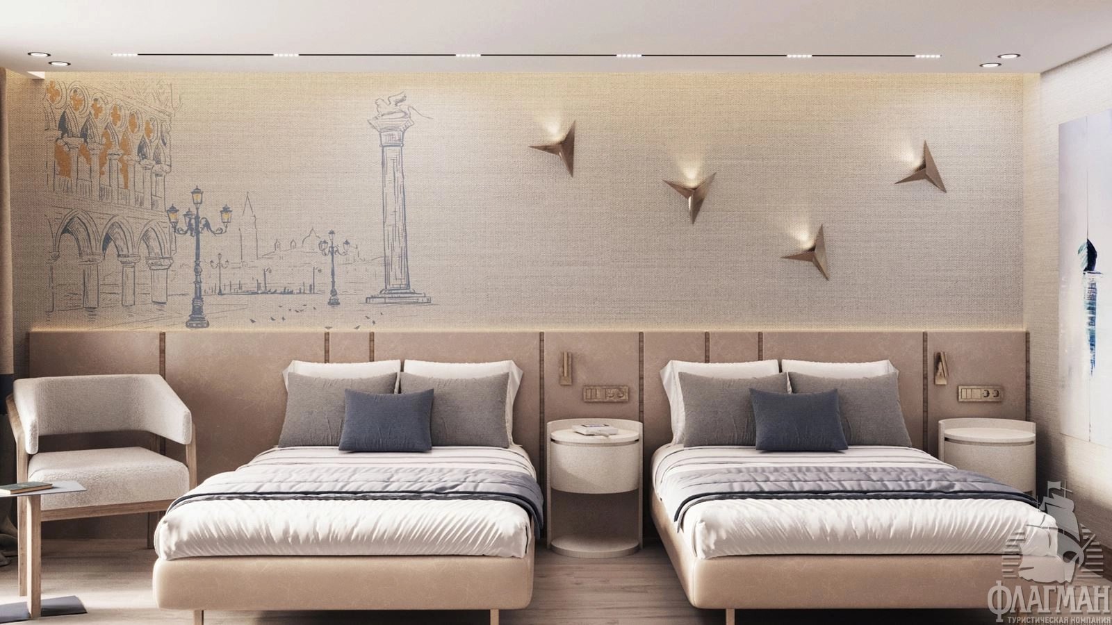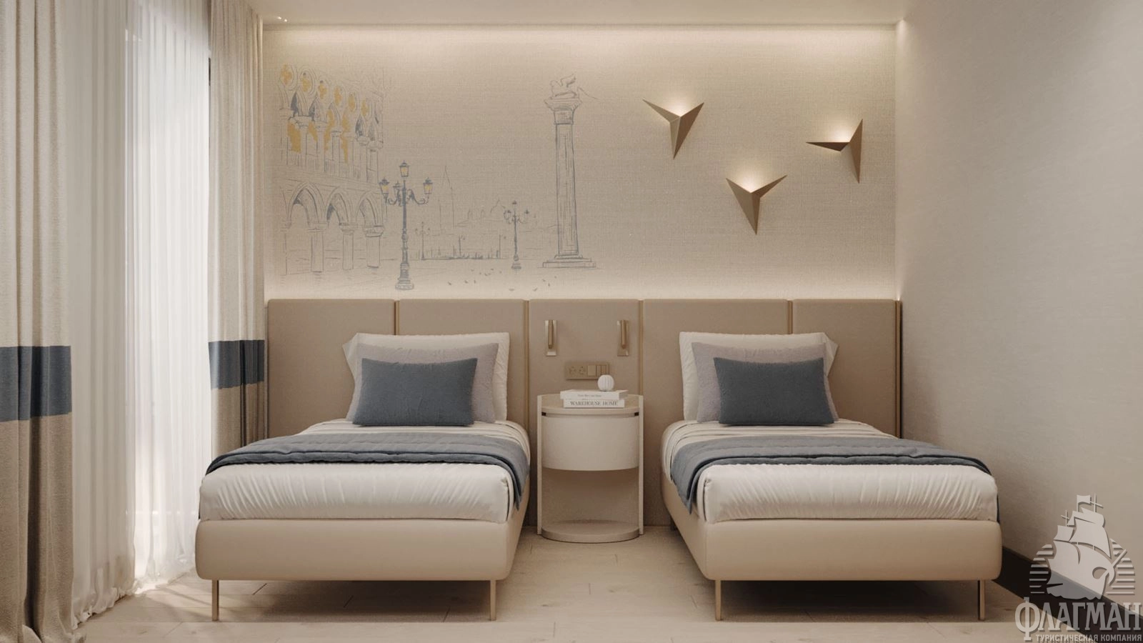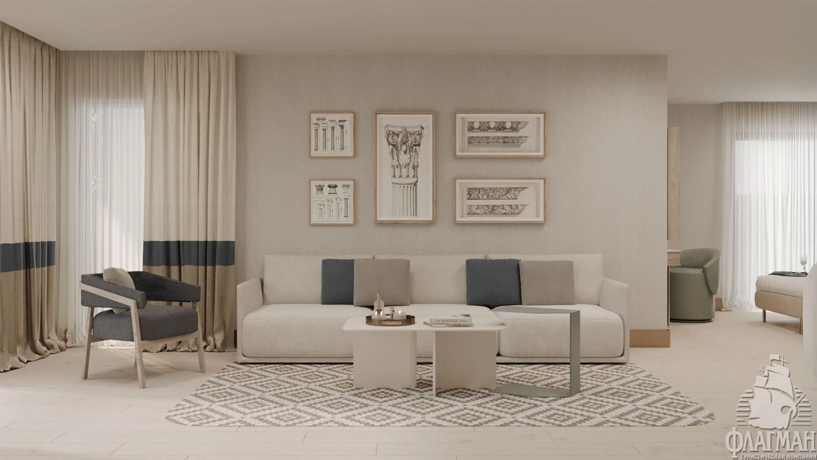 - Corner suite - номер: 60 кв.м, 2 спальни и гостиная с дверью (двуспальная кровать и софа), кухня, 2 ванные комнаты, балкон, частичный вид на море/вид на сад/бассейн, макс. 6 чел.