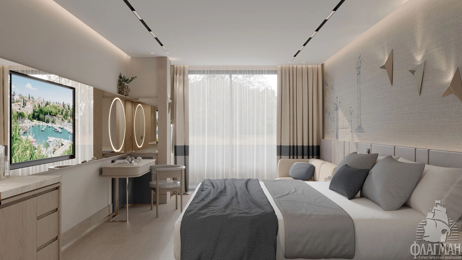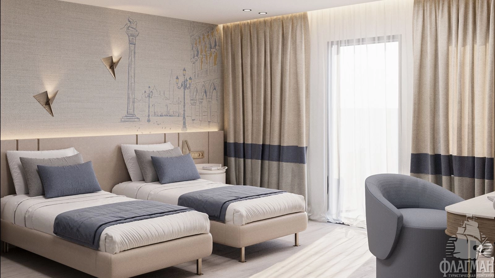 - Deluxe standard side sea or pool view - номер: 28-30 кв.м, двуспальная кровать или 2-3 односпальные, кухня, балкон, вид на море/бассейн, макс. 3 чел.