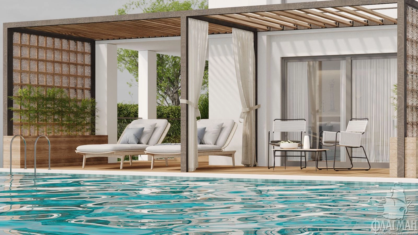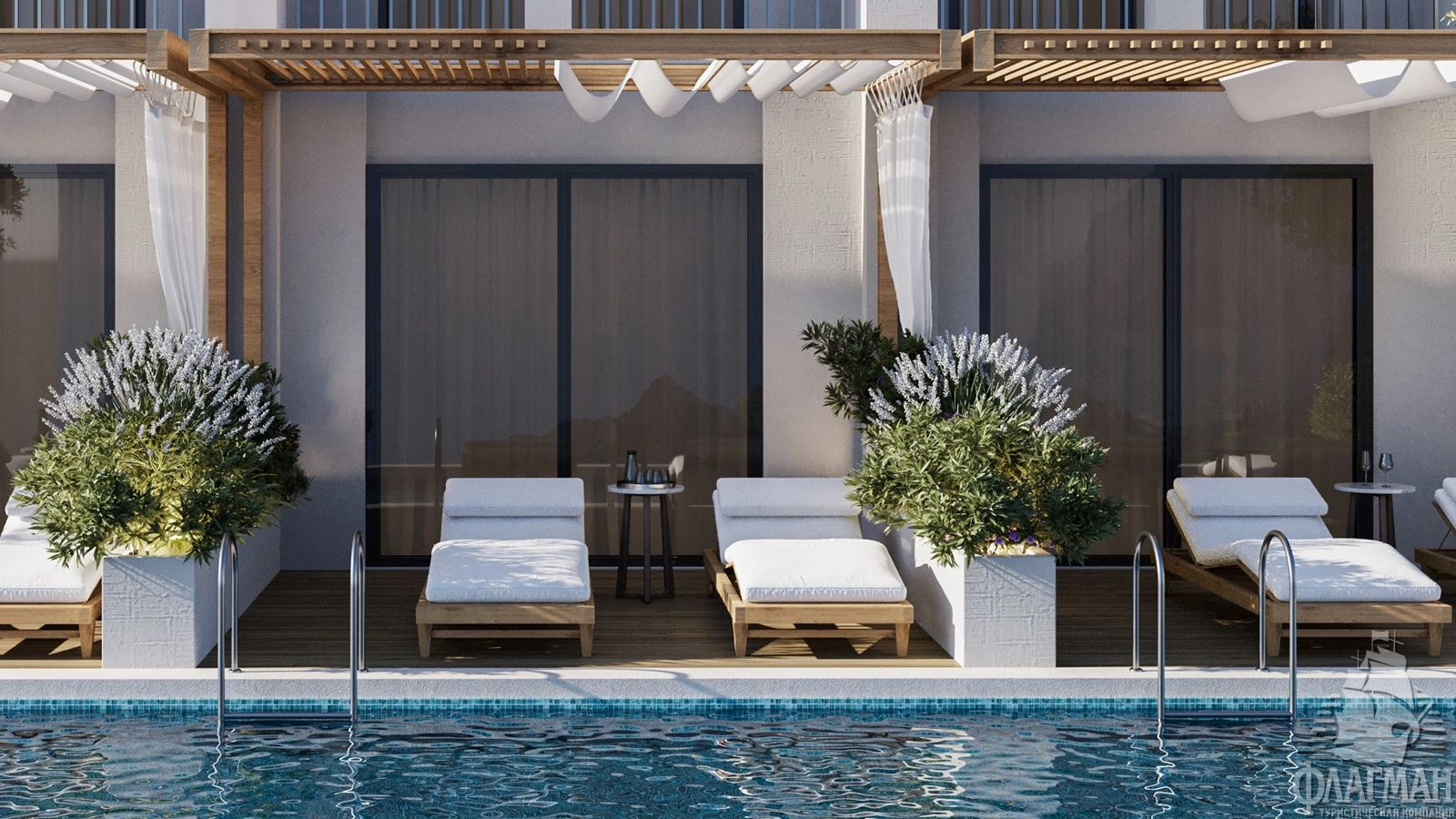 - Swim up - номер: 40 кв.м, двуспальная кровать и софа, кухня, 1 ванная комната, балкон, выход к бассейну, макс. 3 чел.