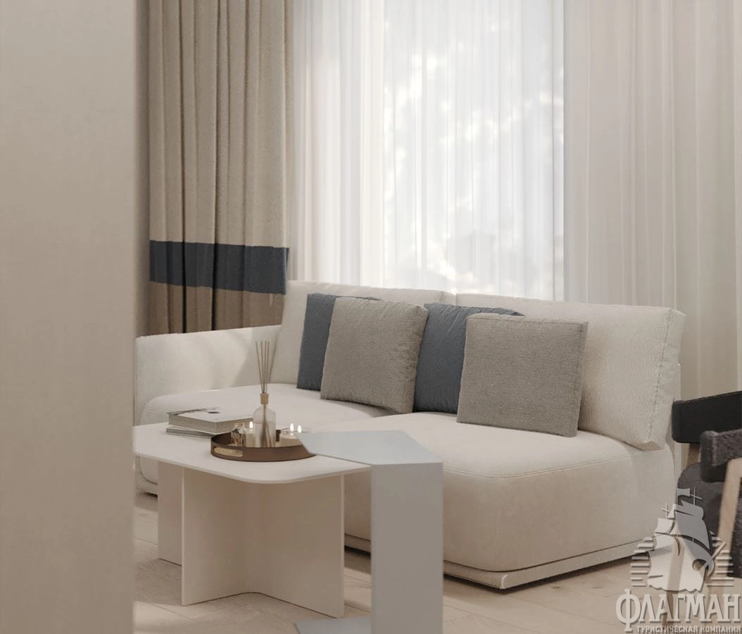 - Junior suite - номер: 55 кв.м, спальня и гостиная с дверью (двуспальная кровать и софа), кухня, 1 ванная комната, балкон, вид на окрестности, макс. 4 чел.