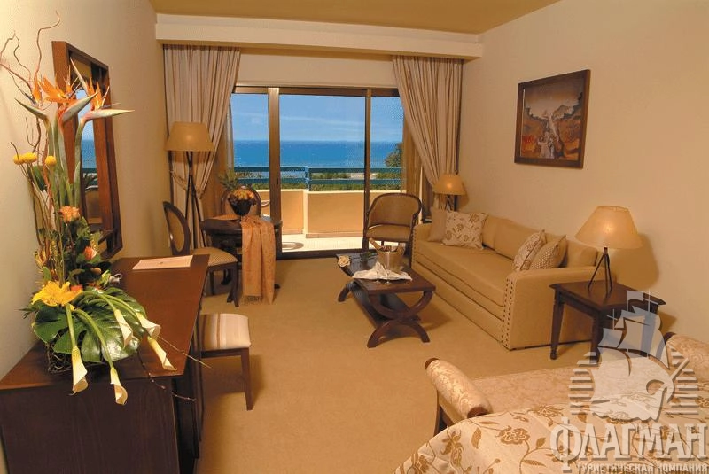 - Junior Suite (макс. 4 чел., 38 м2) – просторный однокомнатный номер, есть гостиный уголок с мягкой мебелью, ванная комната, балкон с видом на море.