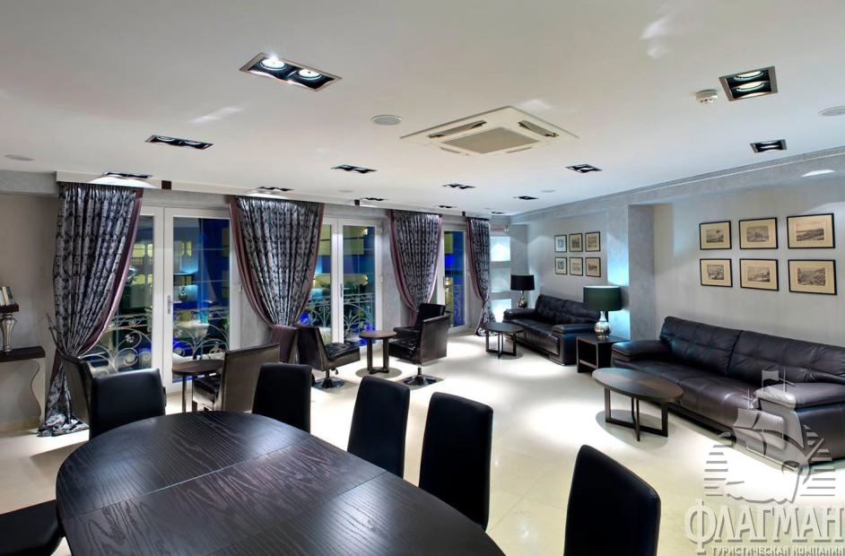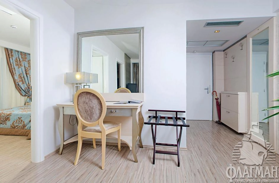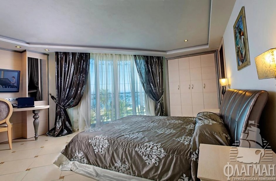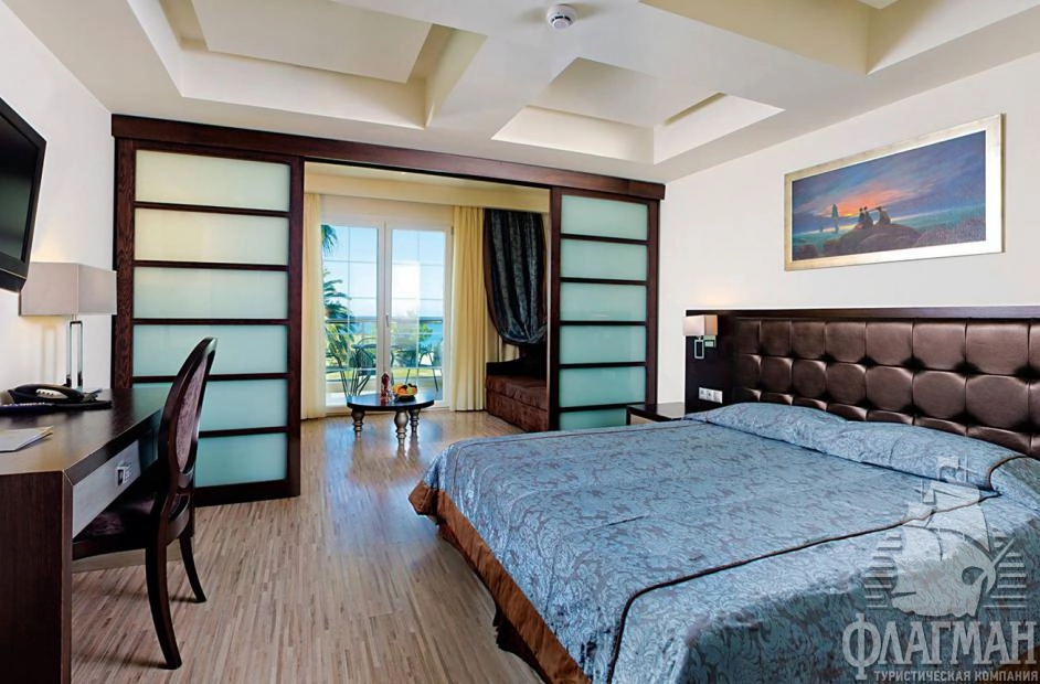 - deluxe suite SV (вид на море, 2 спальни и отдельная гостиная, осн. кровать — king-size кровать, доп. - 2 односпальные и софа, макс. 4+1 чел., 60 м2).