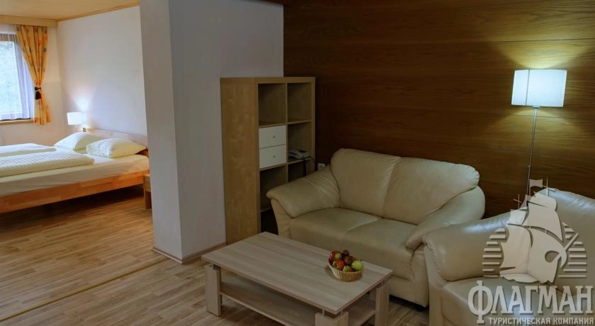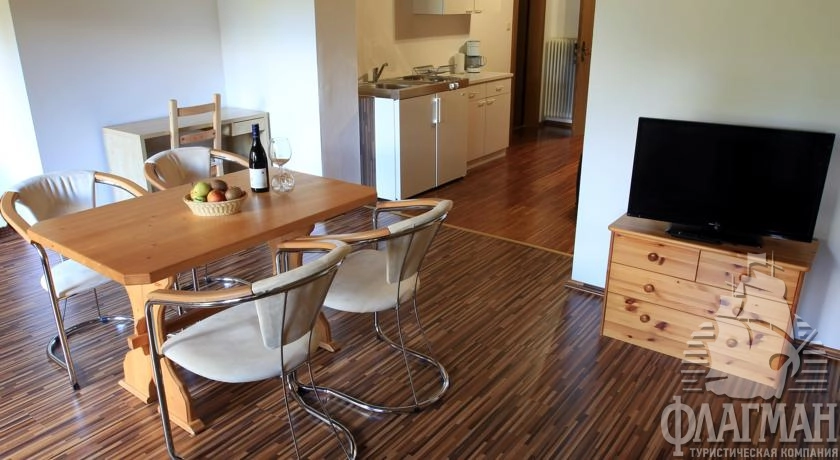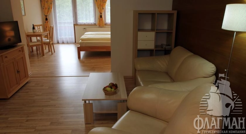- APT: 42–60 м2, на 2–5 чел., спальня с двуспальной кроватью, гостиная с диваном и полностью оборудованным кухонным уголком с холодильником