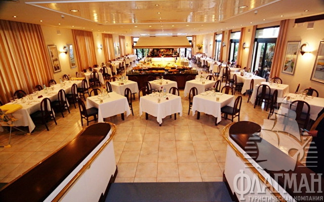 - Завтрак буфет. Ужин по меню, обслуживание за столиками. Ресторан – идеальное место для встреч и отдыха. Находится на открытой веранде с видом на море, позволяет насладиться спокойной и расслабляющей атмосферой. Известен своей кухней, предлагает широкий выбор блюд традиционной местной кухни и специальные блюда от шеф-повара. По вашему заказу могут быть приготовлены вегетарианские и диетические блюда. Великолепная карта вин представлена известными итальянскими и французскими винами.