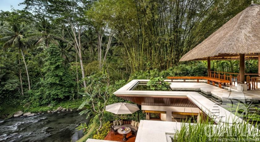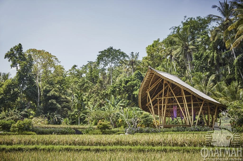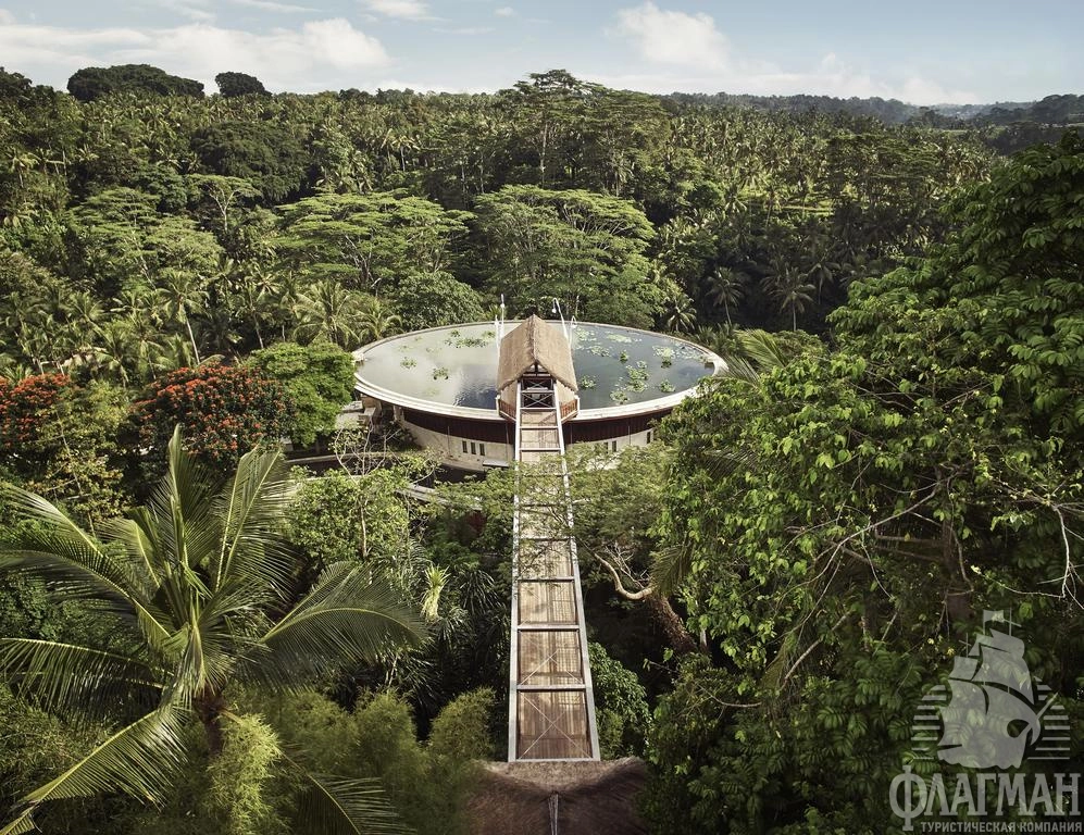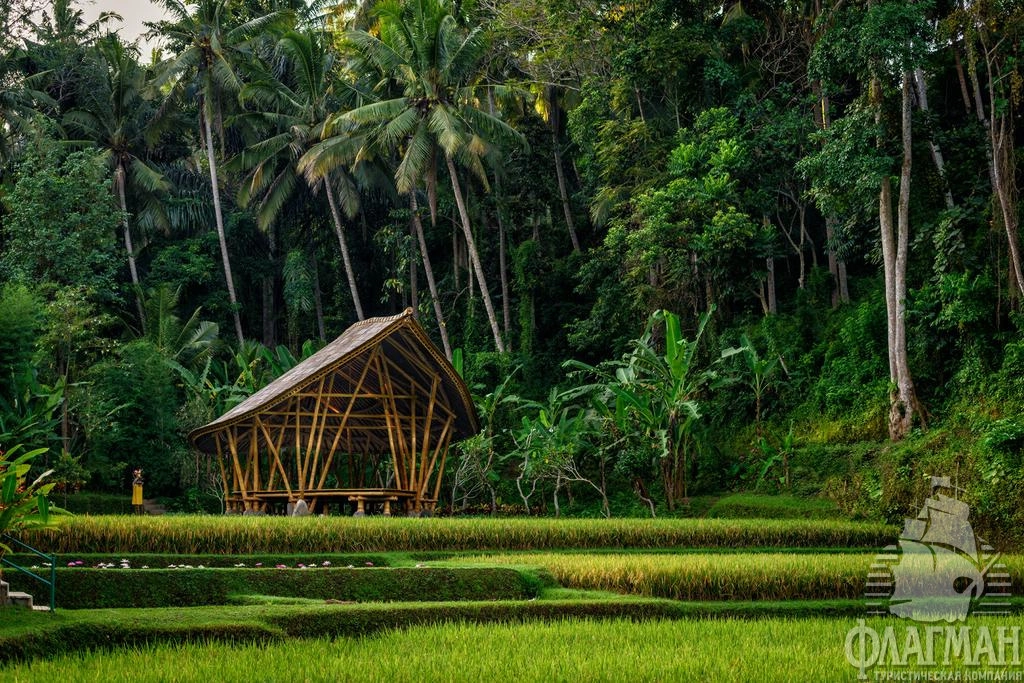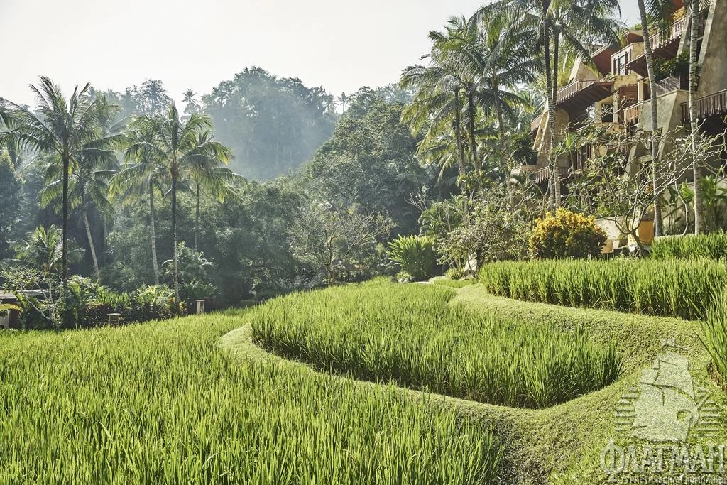 Расположен в 35 км от аэропорта, на курорте Убуд, среди жипописных рисовых полей.