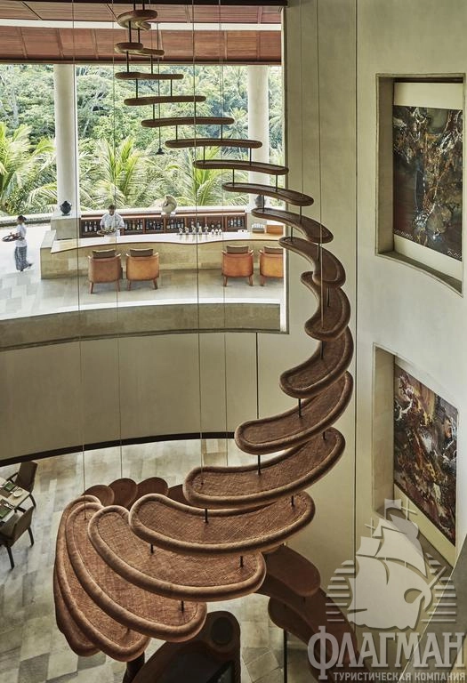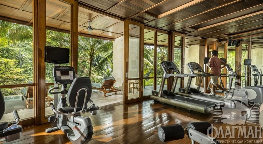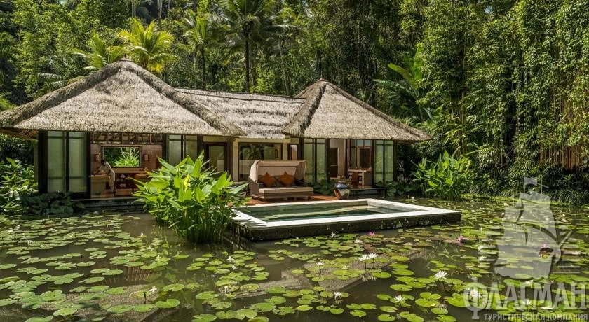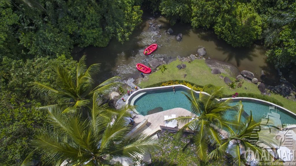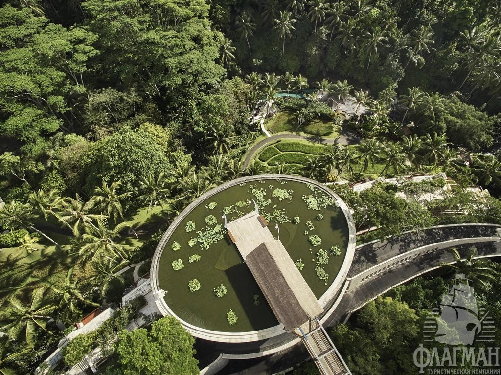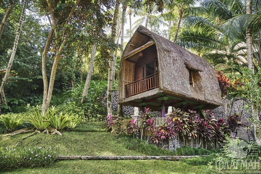 Расположен в 35 км от аэропорта, на курорте Убуд, среди жипописных рисовых полей.