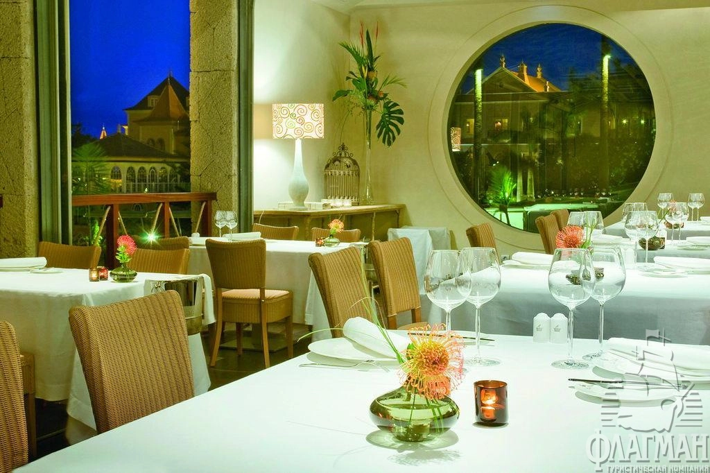 - 8 ресторанов (El Bernegal – международная кухня, открыт на завтрак и ужин, в вечернее время можно насладиться представлением show cooking; a la carte Las Aguas на территории Villas – эксклюзивный ресторан с тщательно продуманным интерьером; a la carte La Brasserie – французская кухня, дегустация аперитивов, закусок, обеды и ужины; a la carte La Trattoria – уголок Италии с теплой и веселой атмосферой; a la carte Beach Club – средиземноморская кухня, большой выбор морепродуктов, всегда свежая рыба; a la carte La Tasca – большой выбор испанских блюд, каждый вечер живая испанская музыка; a la carte La Hacienda – кухня трех континентов)
