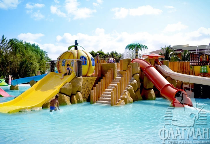 - однокомнатные Junior Family Suite (номера расположены в виллах, окруженных тропической зеленью, рядом с аквапарком, макс. 3+1 чел., 2 full-size кровати (1,35x2) или 1 king (2x2), номера имеют удобства для всей семьи; халаты и тапочки для детей и родителей, детские банные принадлежности, приветственный подарок со сладостями, гостиная с диваном-кроватью, балкон или терраса, гидромассажная ванна);