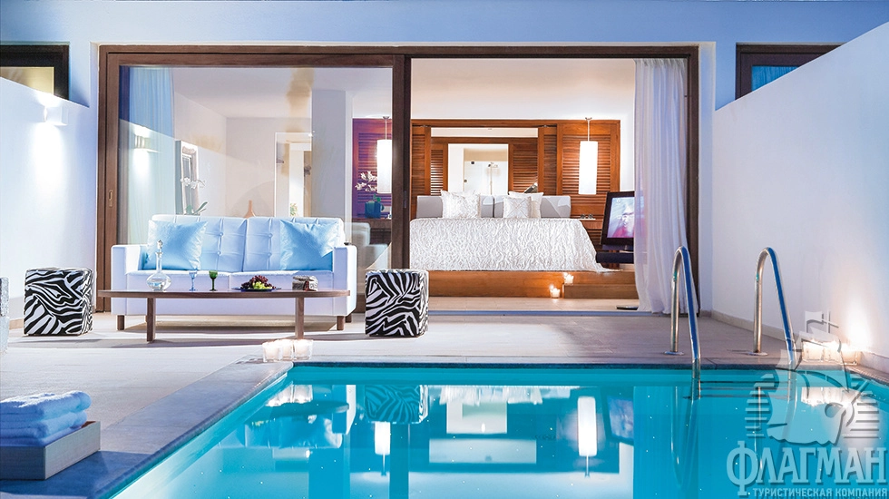 - luxury junior suite with private heated pool & gym SV (на море, расположены в саду, на второй линии от моря, спальня с гостиной зоной, двуспальная кровать, доп. – софа, отдельная зона для фитнеса, терраса (45,5 м2), индивидуальный бассейн с подогревом (18 м2), макс. 2+1 чел., 61 м2),