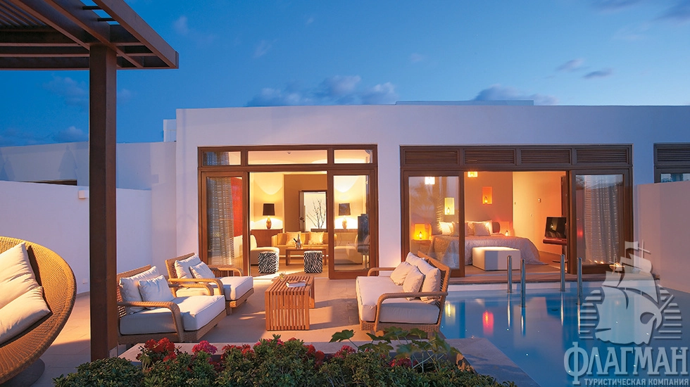 - deluxe junior bungalow suitewith sea view & private heated pool (в саду, вторая линия, спальня с гостиной зоной, двуспальная кровать, доп. – софа, индивидуальный бассейн с подогревом (18 м2), макс. 2+1 чел., 45 м2),