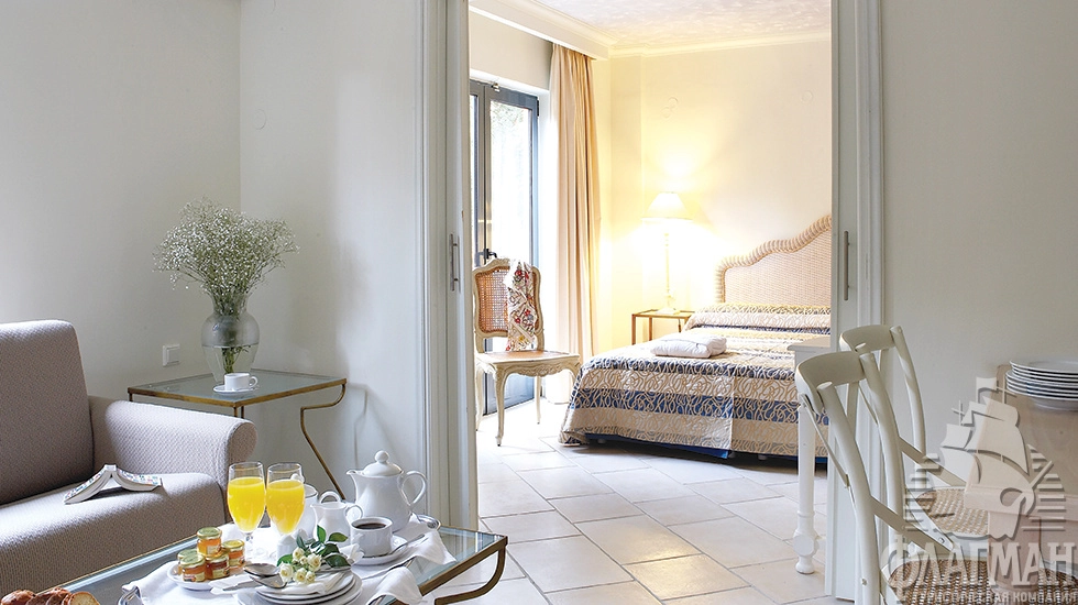 - 1-bedroom apartment (вид на сад или бассейн, расположены на 1 или 2 этаже, спальня, отдельная гостиная, основная кровать – двуспальная, ванная комната, макс. 4 чел., 38-46 м2)