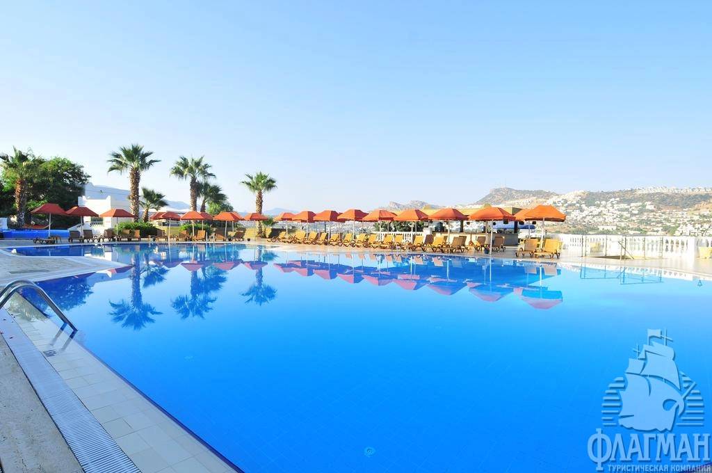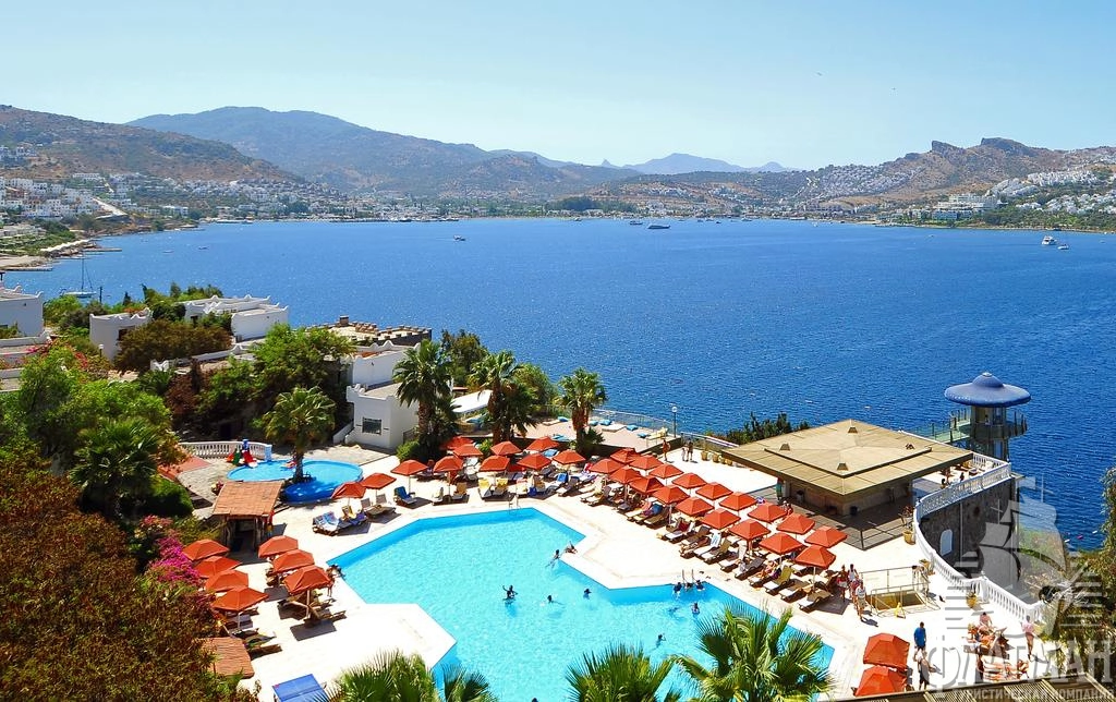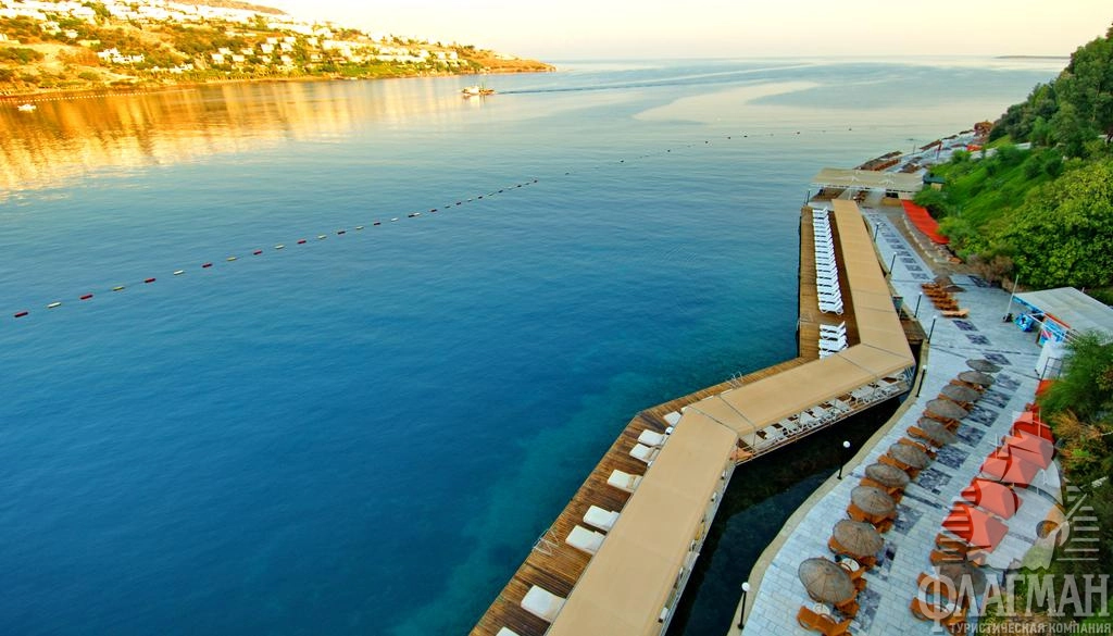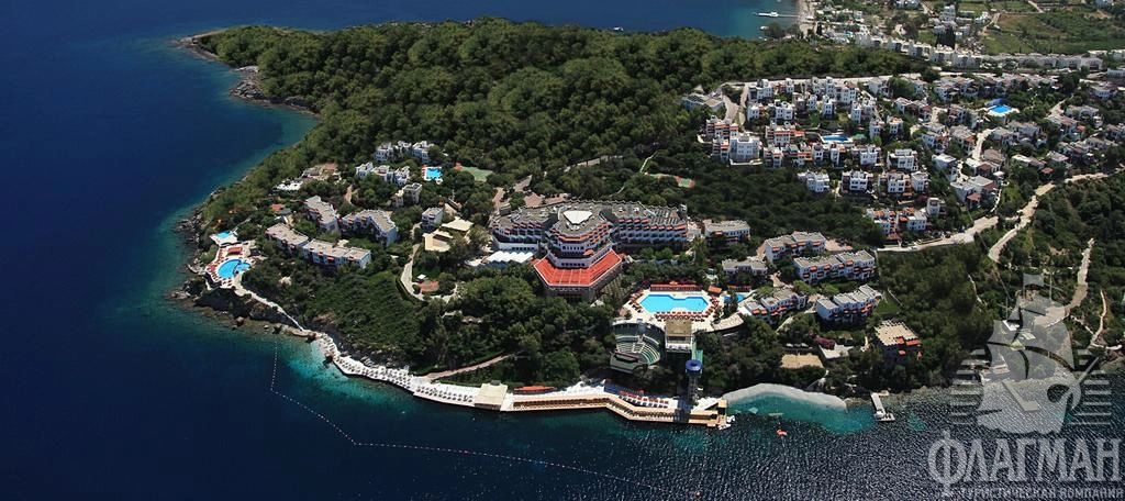 Расположен в 45 км от аэропорта, в 1 км от центра г. Бодрум, в 2 км от центра поселка Гюндоан, на берегу моря.