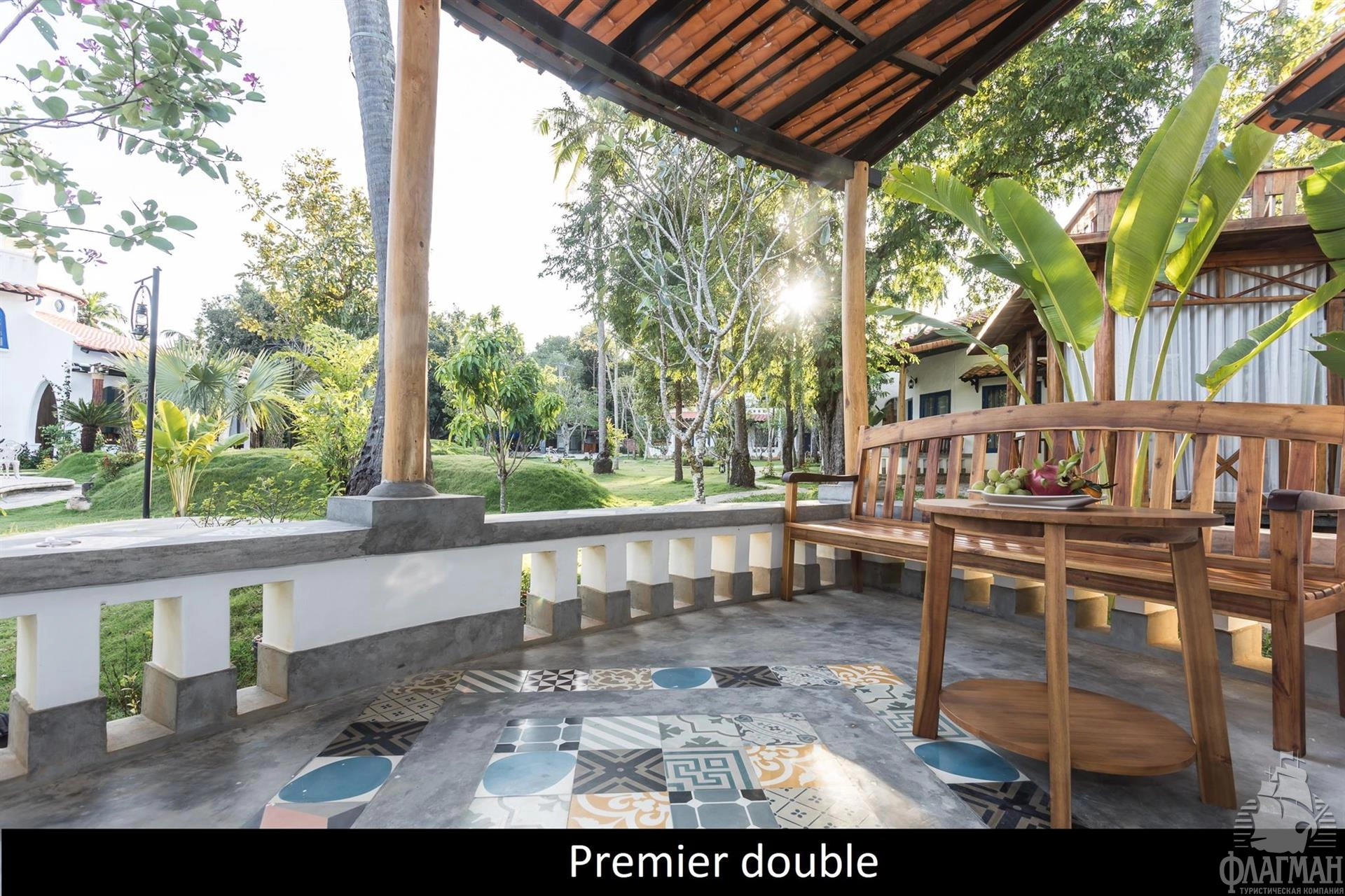 - Premier double (38 кв.м, макс. 3 взрослых + ребёнок) - спальня (dbl bed 2x2 м), ванная комната, балкон с видом на сад