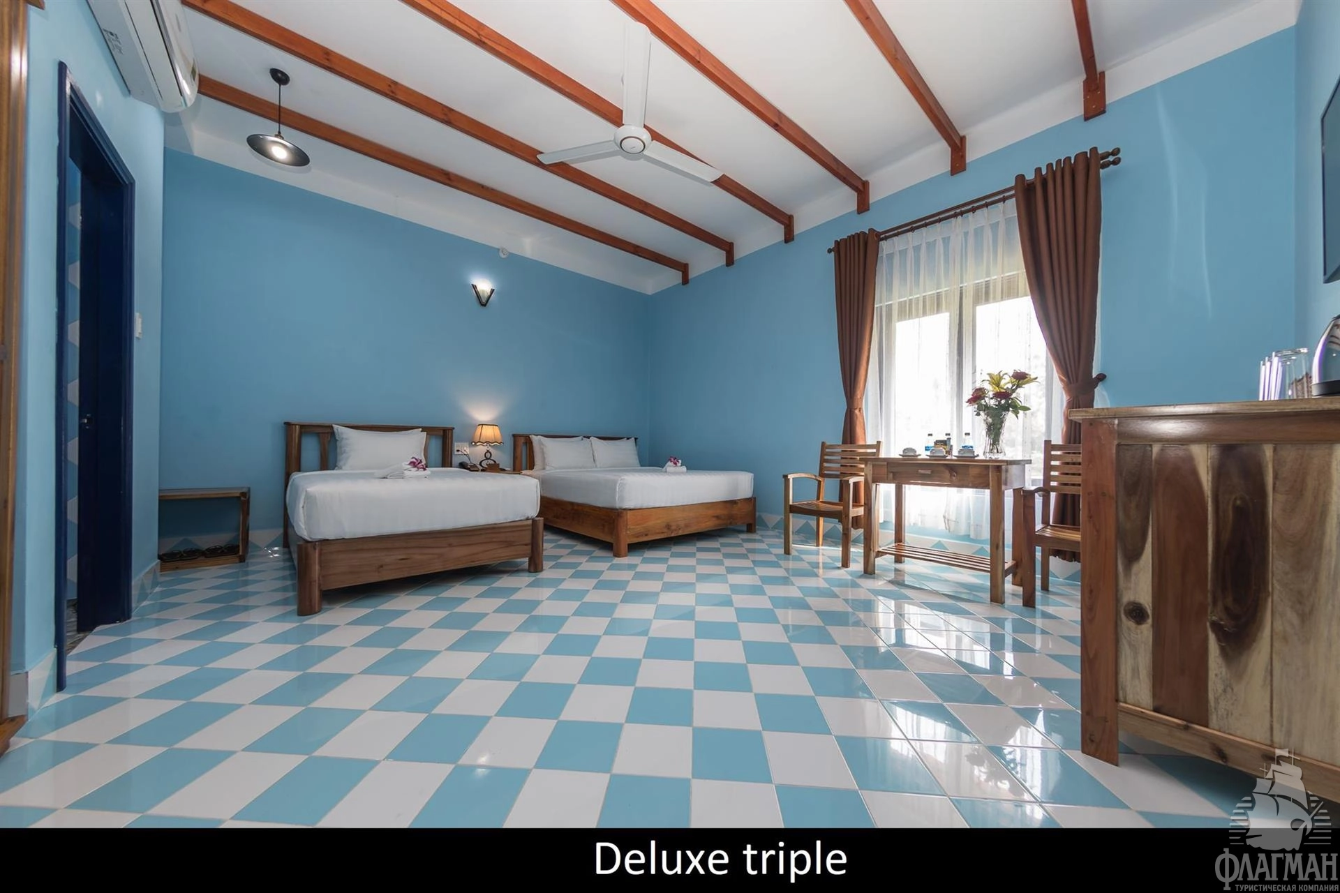 - Deluxe triple (38 кв.м., макс. 3 взрослых + ребёнок) - спальня (dbl bed 1,6x2 м + sgl bed 1,2x2 м), ванная комната, балкон с видом на сад