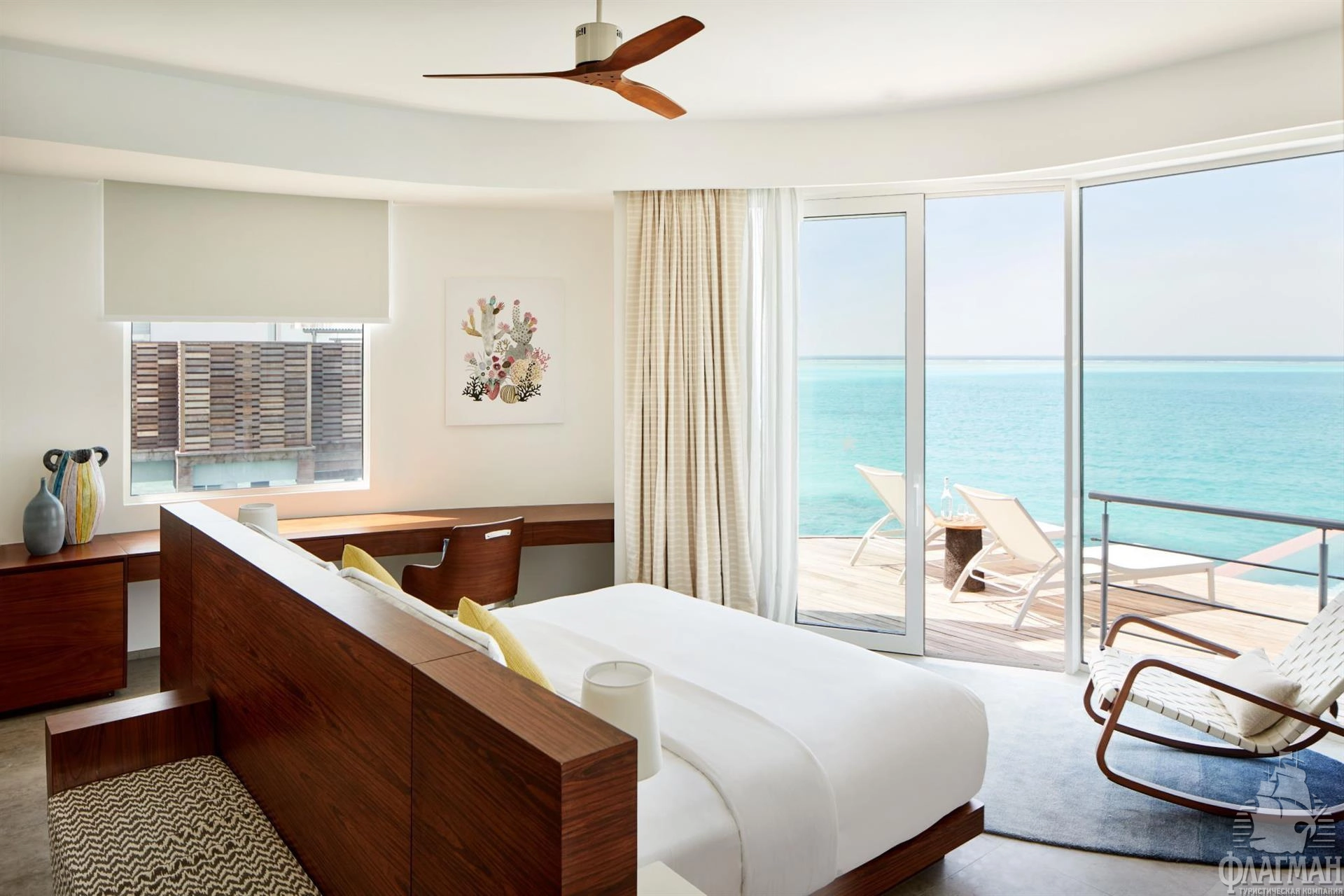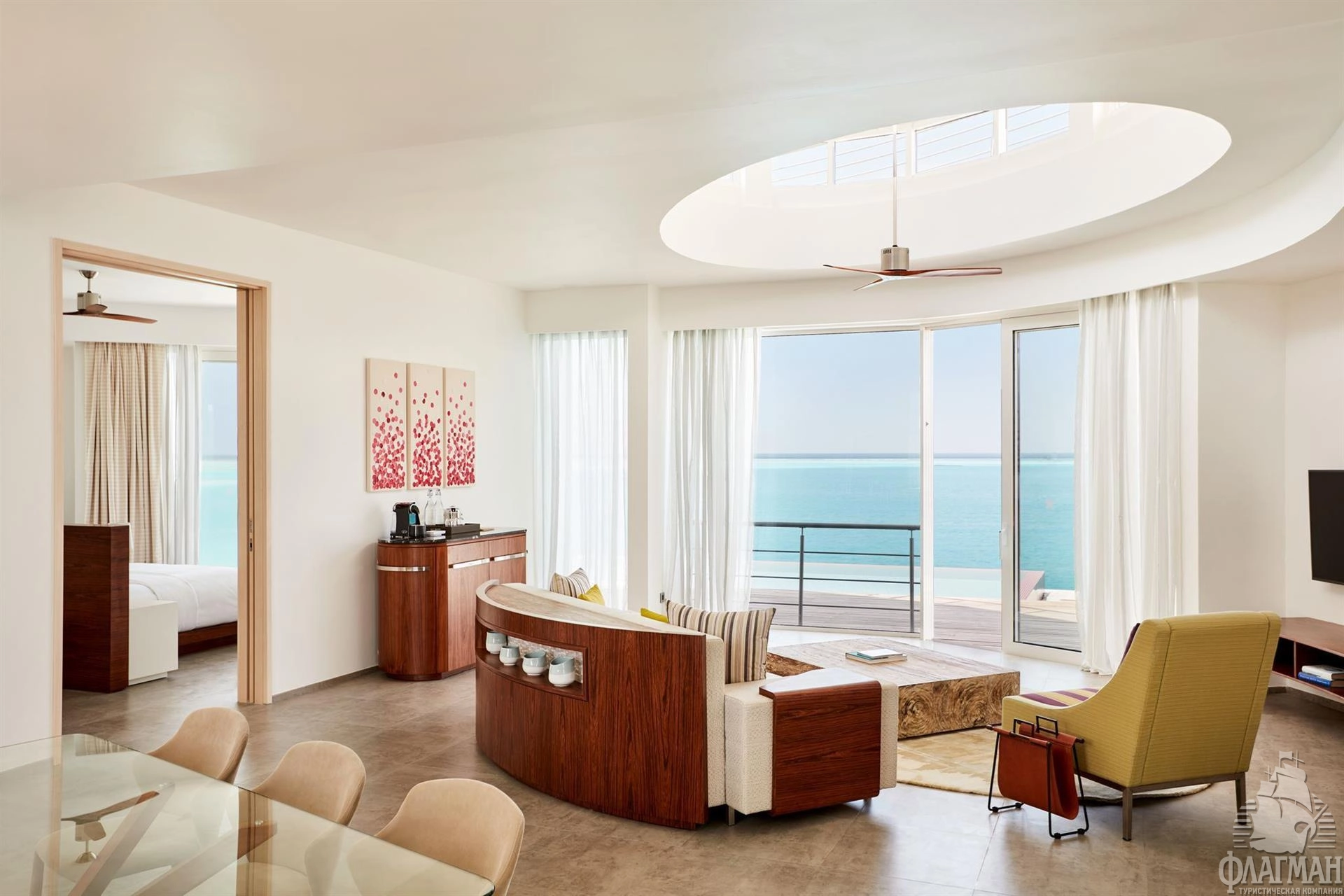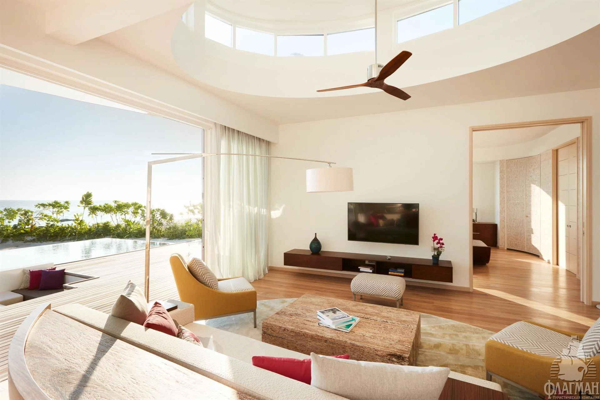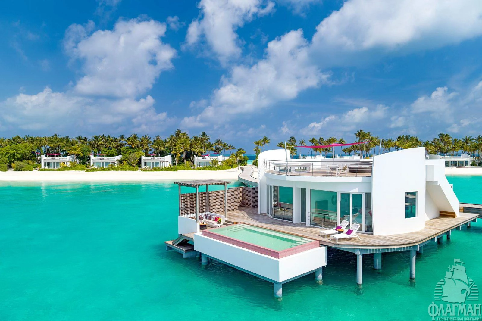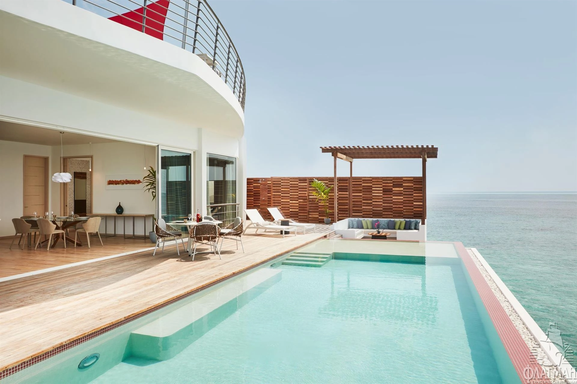1 Three Bedroom Water Retreat with Pool (~997 кв.м) - водный двухэтажный ретрит с бассейном с виодм на закат. Состоит из 2 спален с кроватями king size, спальни с раздельными кроватями, просторной гостиной с обеденной зоной, ванных комнат, сауны, парной, фитнес комнаты, оборудованной террасы гамаками и зоной отдыха на крыше, двух балконов на втором этаже и террасы с бассейном (18x6,3x1,2), зоной для дневного отдыха и причалом для яхты на нижнем уровне. Максимальное размещение - 7 взрослых и 1 ребенок или 6 взрослых и 2 ребенка.
