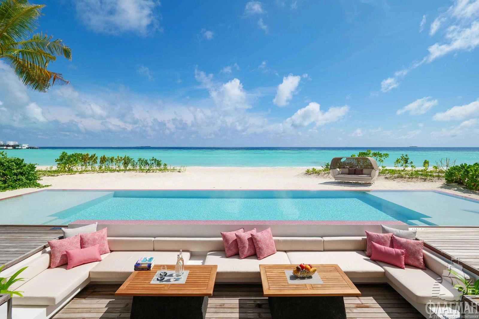 4 Two Bedroom Beach Residence with Pool (~680 кв.м) - пляжная трехкомнатная резиденция с бассейном. Состоят из гостиной с обеденной зоной, спальни с кроватью king-size, спальни с раздельными кроватями, 2 ванных комнат с отдельной ванной и крытым и открытым душами, оборудованной террасы на крыше и террасы с зоной отдыха и бассейном (14,3x4,2x1,2). Максимальное размещение - 5 взрослых и 1 ребенок или 4 взрослых и 2 ребенка.