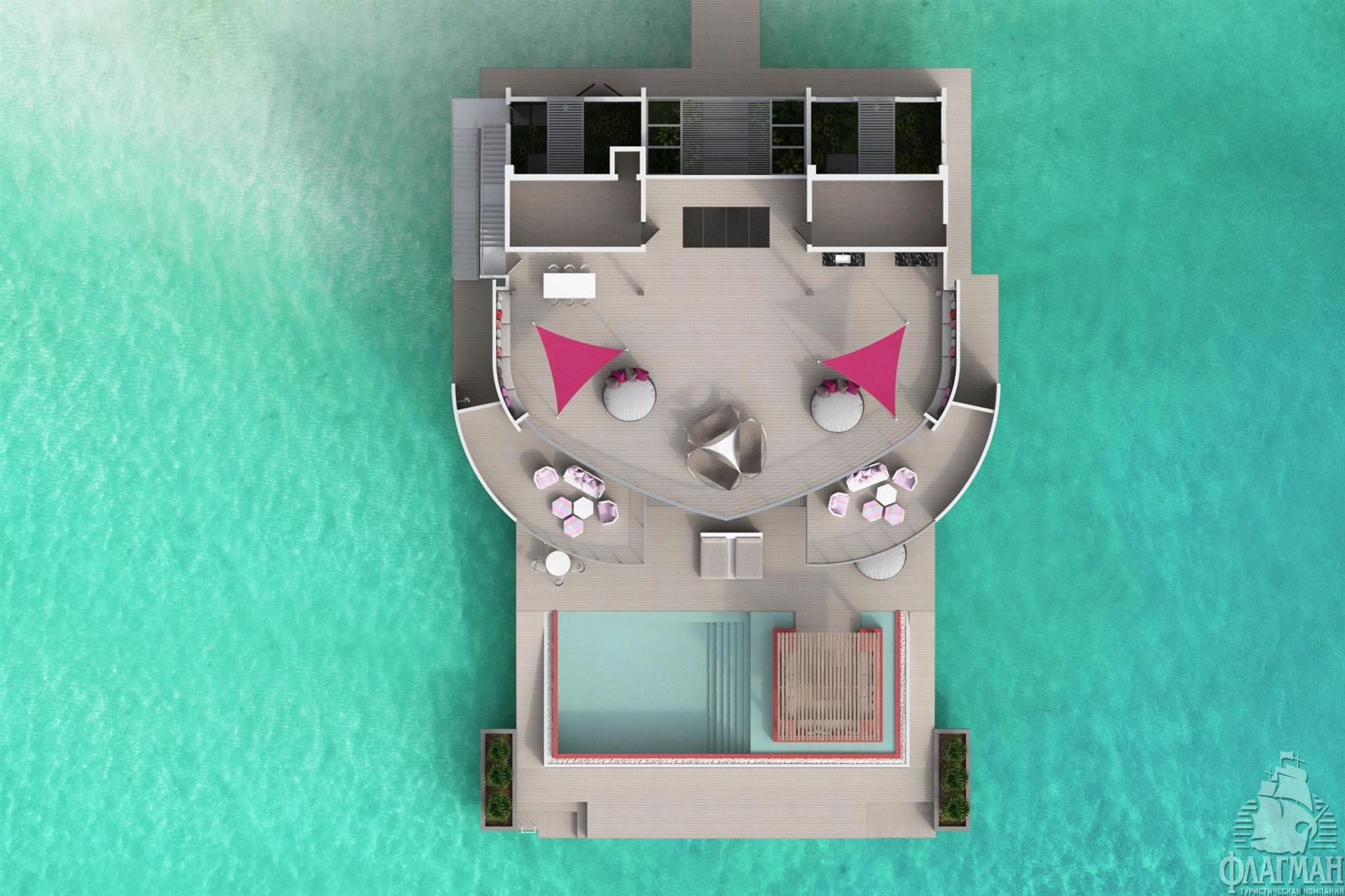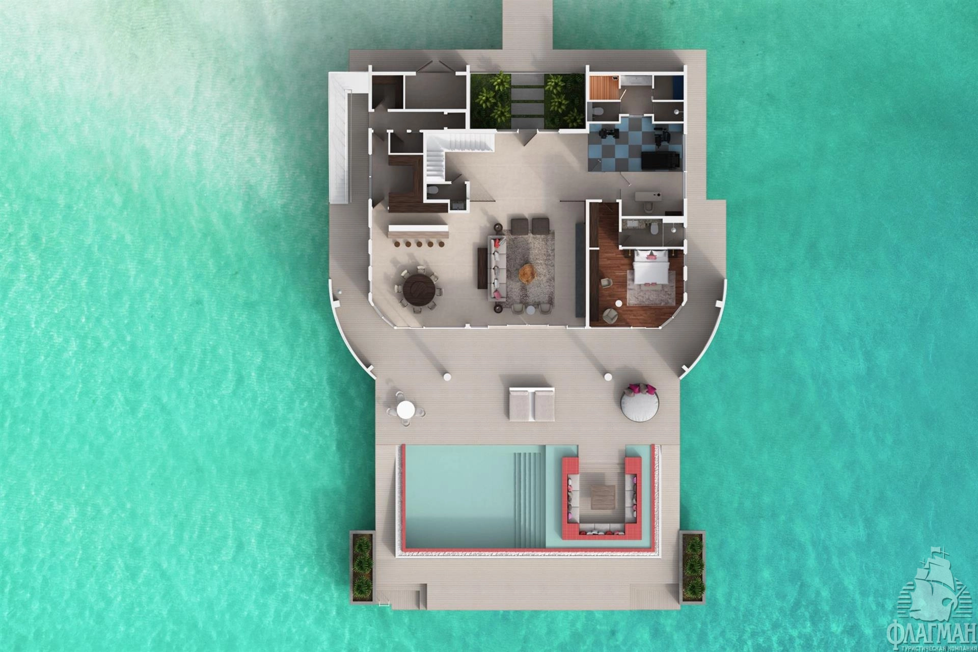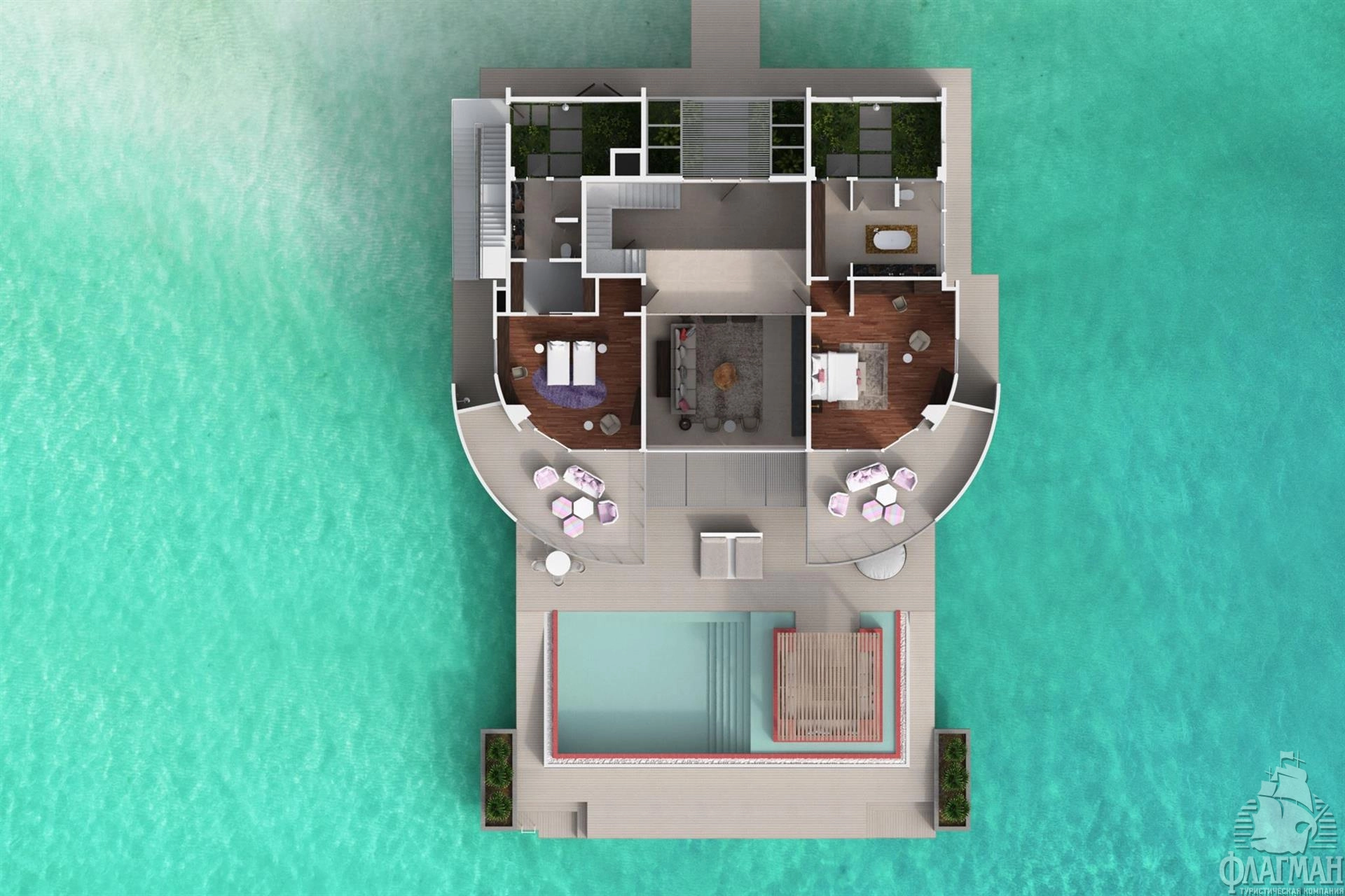 4 Two Bedroom Water Residence with Pool (~680 кв.м) - водная трехкомнатная резиденция с бассейном. Состоят из гостиной с обеденной зоной, спальни с кроватью king-size, спальни с раздельными кроватями, ванной комнаты с отдельной ванной и душем, оборудованной террасы на крыше и террасы с зоной отдыха и бассейном (14,3x4,2x1,2). Максимальное размещение - 5 взрослых и 1 ребенок или 4 взрослых и 2 ребенка.