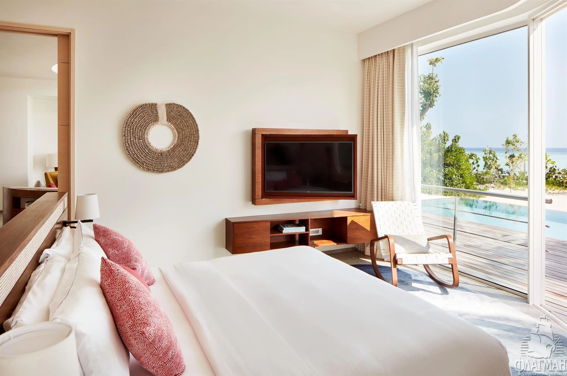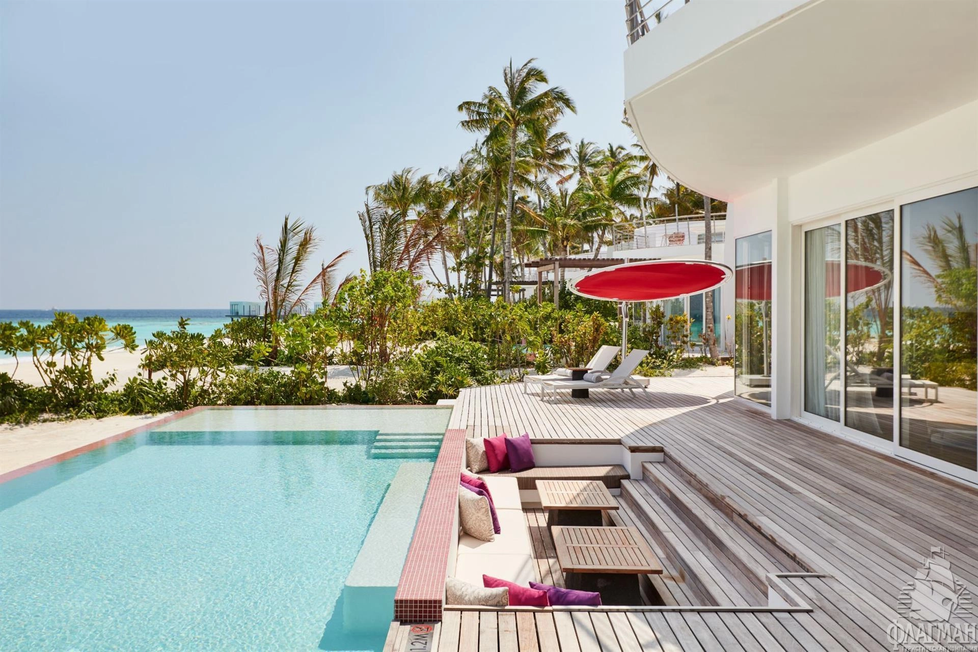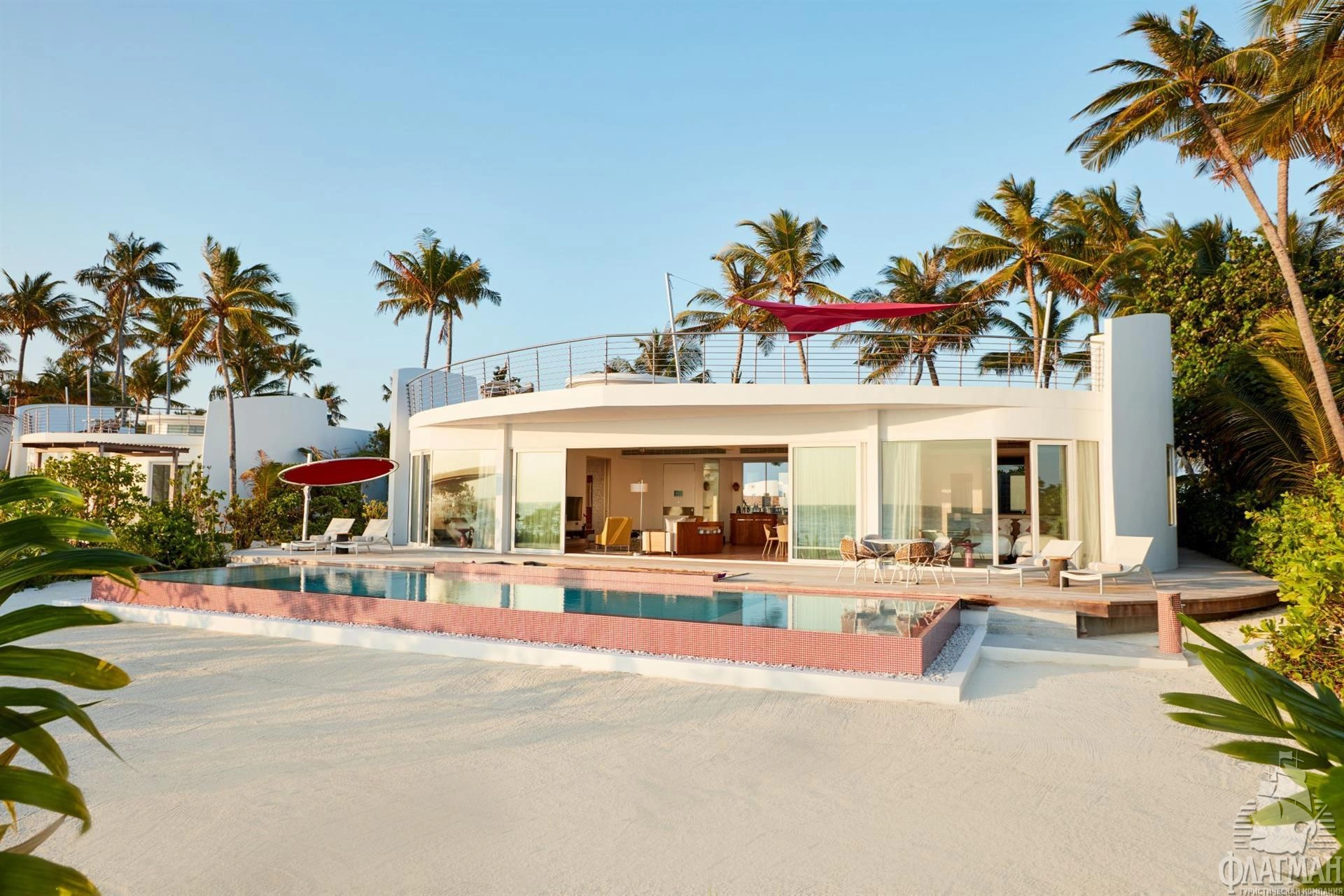 1 Three Bedroom Beach Retreat with Pool (~970 кв.м) - береговой двухэтажный ретрит с бассейном. Состоит из двух спален с кроватями king size, спальни с раздельными кроватями, просторной гостиной с обеденной зоной, ванных комнат, сауны, фитнес комнаты, оборудованной террасы на крыше с обеденной зоной, гамаками и зоной отыха, двух балконов на втором этаже и террасы с бассейном (18x6,3x1,2) и зоной для дневного отдыха на нижнем уровне. Максимальное размещение - 7 взрослых и 1 ребенок или 6 взрослых и 2 ребенка.