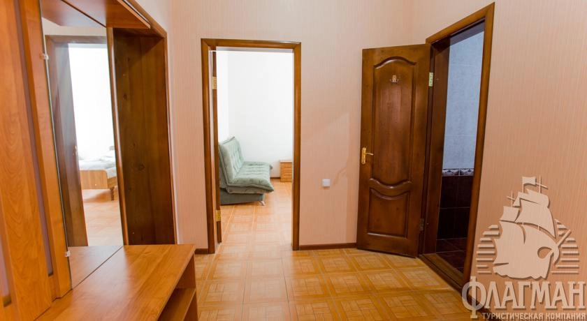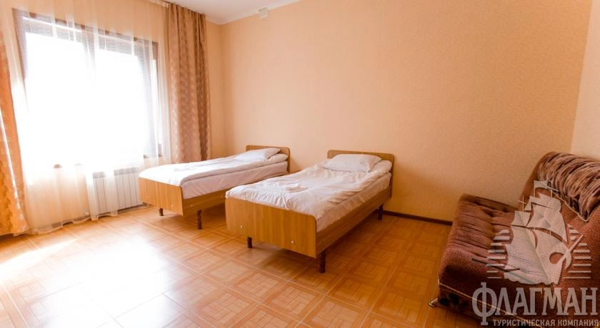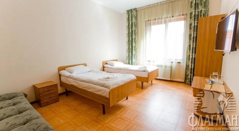 - 4-местный Стандарт. В номере: две изолированные комнаты, прихожая, ванная комната. В каждой комнате: 2 односпальные кровати, диван, прикроватные тумбы, телевизор, шкаф. В ванной комнате: ванная, раковина, унитаз, полотенца, средства личной гигиены. В номере возможно 2 доп. места.