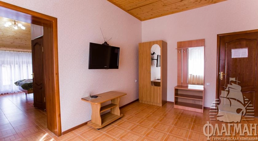 - 3-местный Семейный. В номере: две смежные комнаты,ванная комната. В первой комнате: двухспальная кровать,прикроватные тумбы,шкаф. Во второй комнате: односпальная кровать/диван, телевизор, шкаф, журнальный столик. В ванной комнате: ванная, раковина, унитаз, полотенца, средства личной гигиены. В каждом номере возможно доп. место.