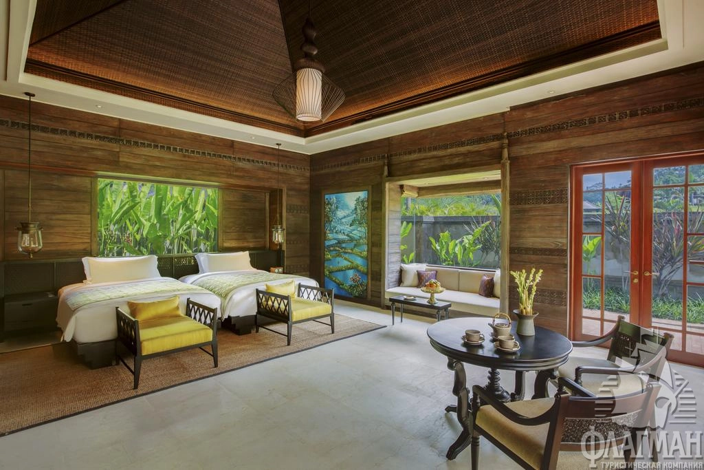 - 1 Mandapa 3-bedroom Pool Villa (2000 м2, 2 спальни с кроватью king size, одна спальня с 2 кроватями twin, сауна, парная, душ на открытом воздухе, гостиная со столовой зоной, кухня, открытый бассейн, макс 7 чел)