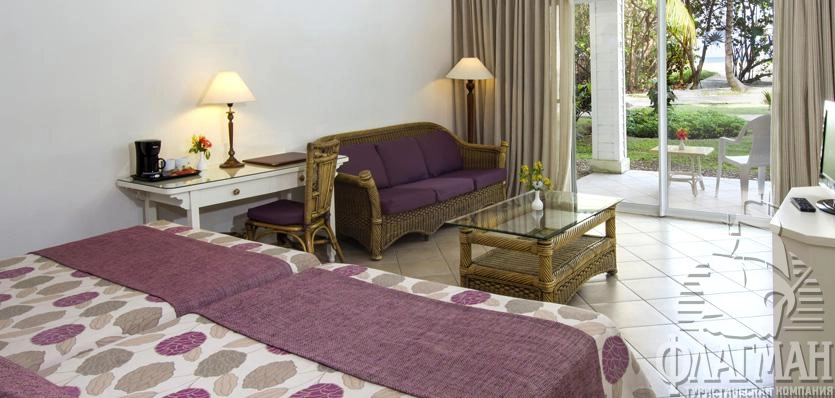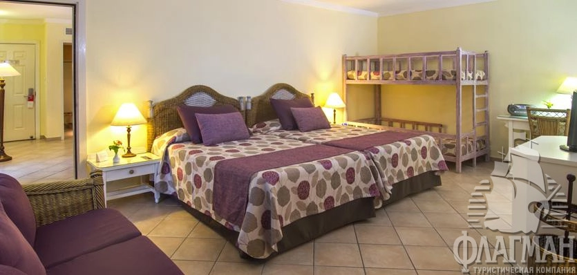 - 20 Family Room (на 1–3 этажах бунгало, зона гостиной и спальни, двухъярусные кровати (twin), постельное белье для детей, бронирование в ресторанах a la carte для семей, макс. 2+2 чел.),