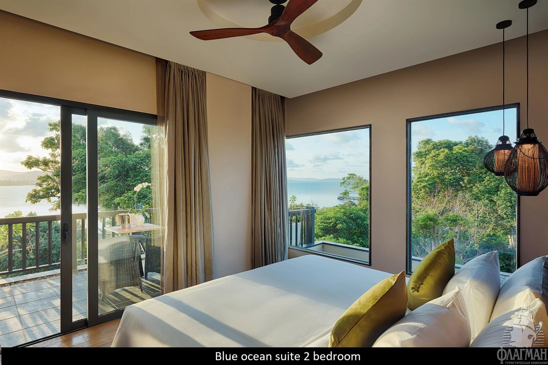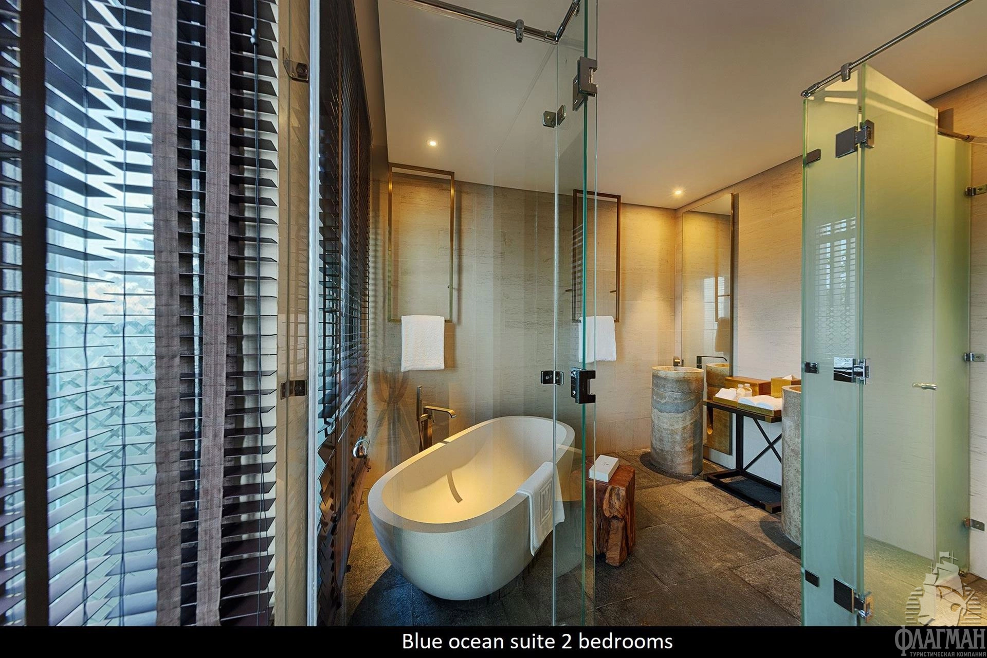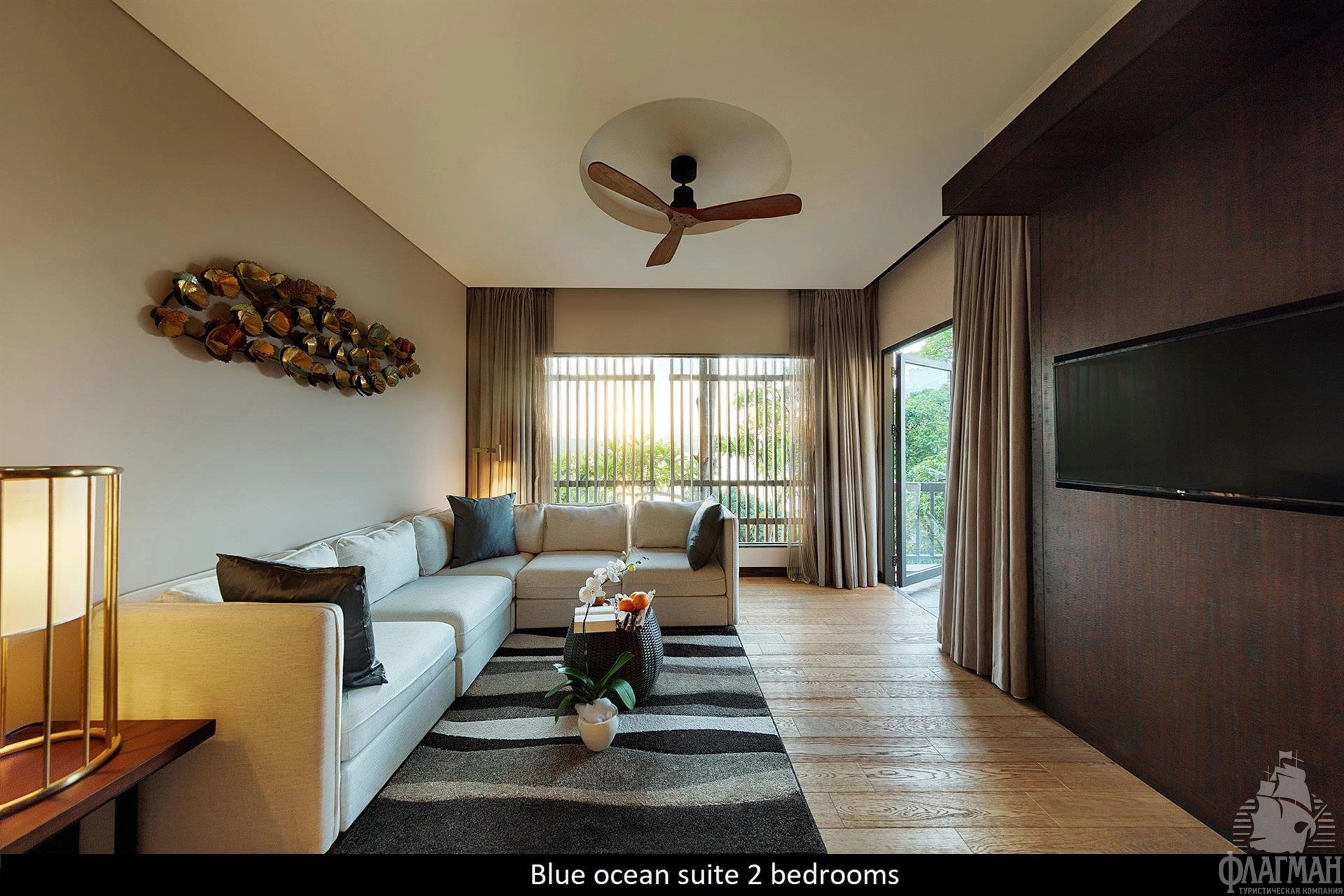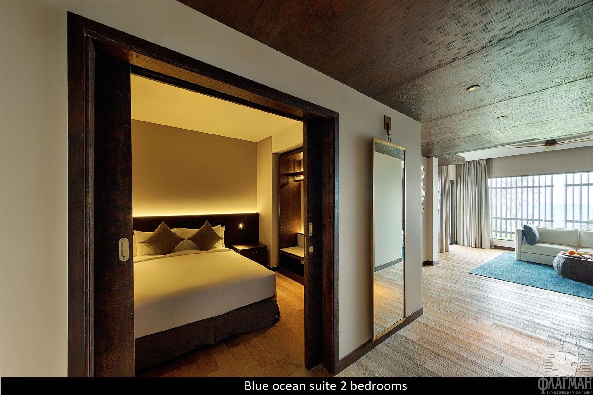 - Blue ocean suite 2 bedrooms (95 кв.м, макс. 4 взрослых + 2 детей/5 взрослых) - 2 спальни (dbl bed + dbl bed), гостиная, 2 ванные комнаты, балкон с видом на море, номера расположены в главном здании