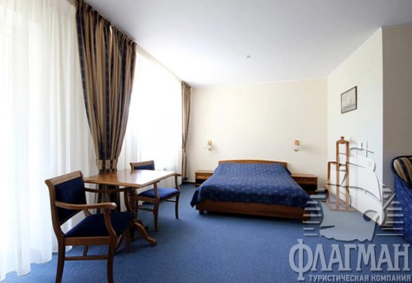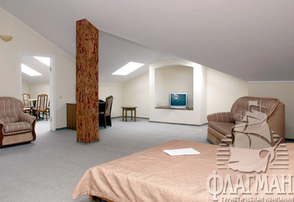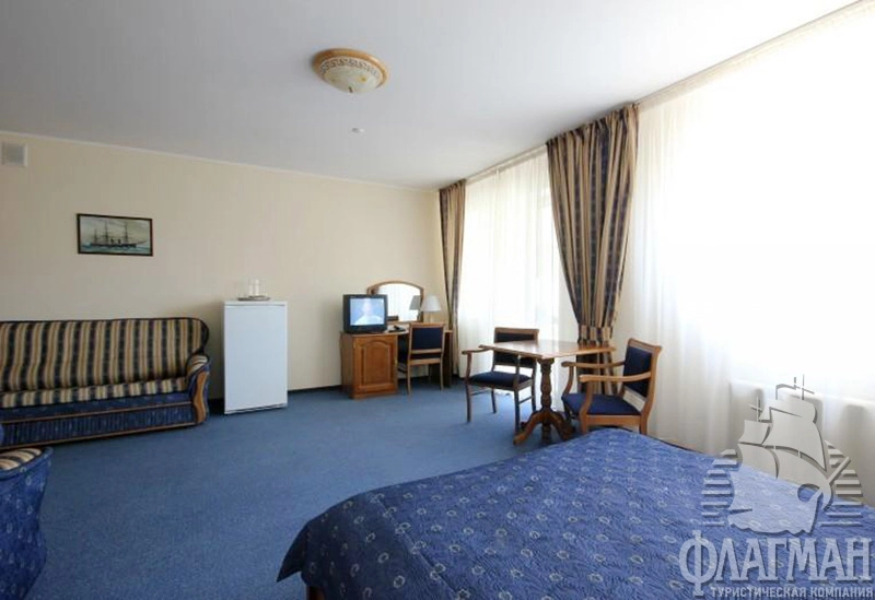 - 2-местный 2-комнатный люкс (макс. 2+2 чел., 46 кв. м, телевизор, кондиционер, душ, туалет, холодильник, лоджия, телефон, 1,5-спальные/ 2-спальная кровать). Доп. место - диван, может быть установлен без ограничения по возрасту.