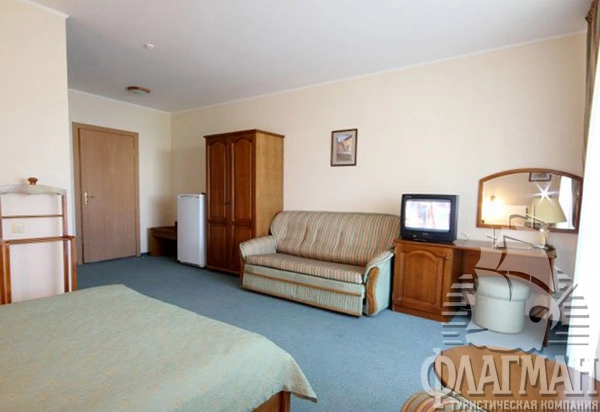 - 1-местный стандартный номер (макс. 1+1 чел., 20 кв. м, телевизор, кондиционер, душ, туалет, холодильник, лоджия, телефон, 1,5-спальная кровать). Доп. место - диван, может быть установлен без ограничения по возрасту.