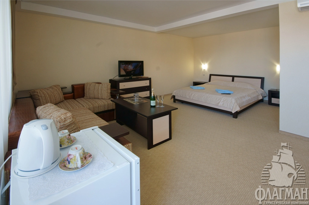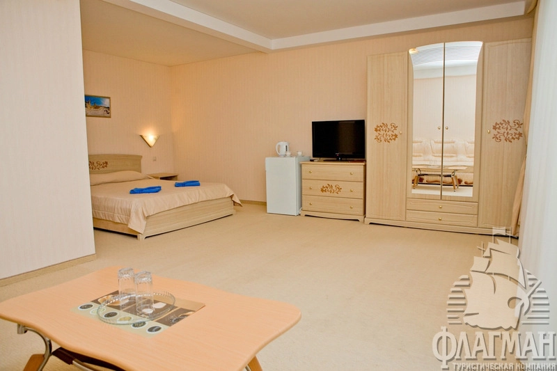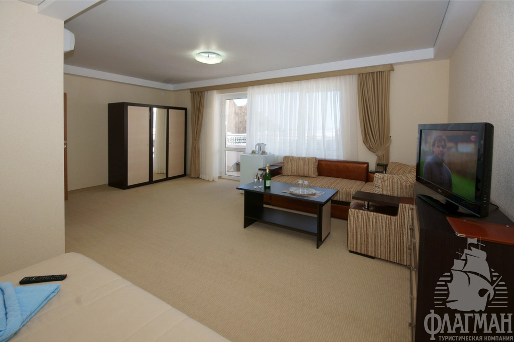 - Полулюкс 2-местный. Просторные номера, оформлены в классическом и современном стиле. В номере: ТВ, холодильник, кондиционер, мини-сейф, роскошный набор мебели с мягким уголком, двуспальная кровать, санузел (туалет, умывальник, душ, набор мини-парфюмерии, фен), балкон. Вид на море или на бассейн. Площадь номера: 36 кв.м. Размещение до 5 человек. Дополнительное место - раскладывающийся диван и еврораскладушка.
