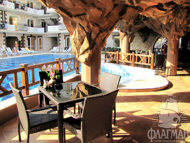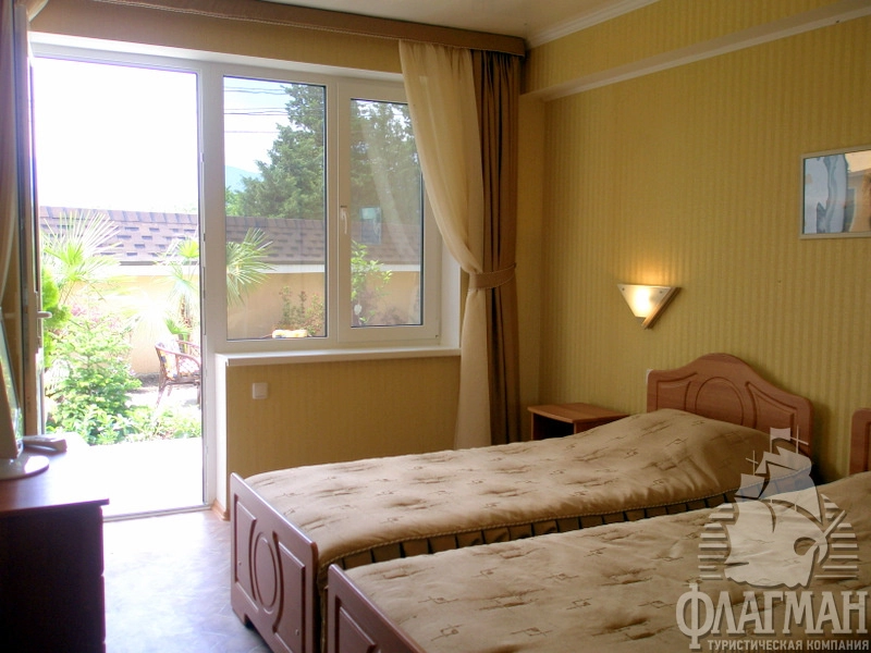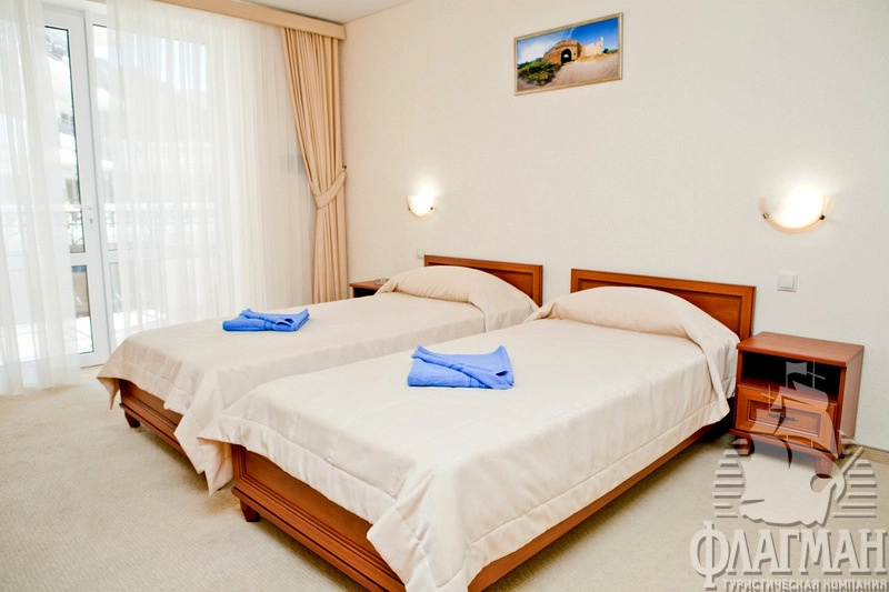 - Стандарт 1 2-местный. В номере: ТВ, холодильник, кондиционер, мини-сейф, набор мебели, двуспальная или две односпальные кровати, санузел (туалет, умывальник, душ, набор мини-парфюмерии, фен), балкон. Вид во внутренний дворик отеля, сад и море. Площадь номера: 20 кв.м. Дополнительное место - еврораскладушка.