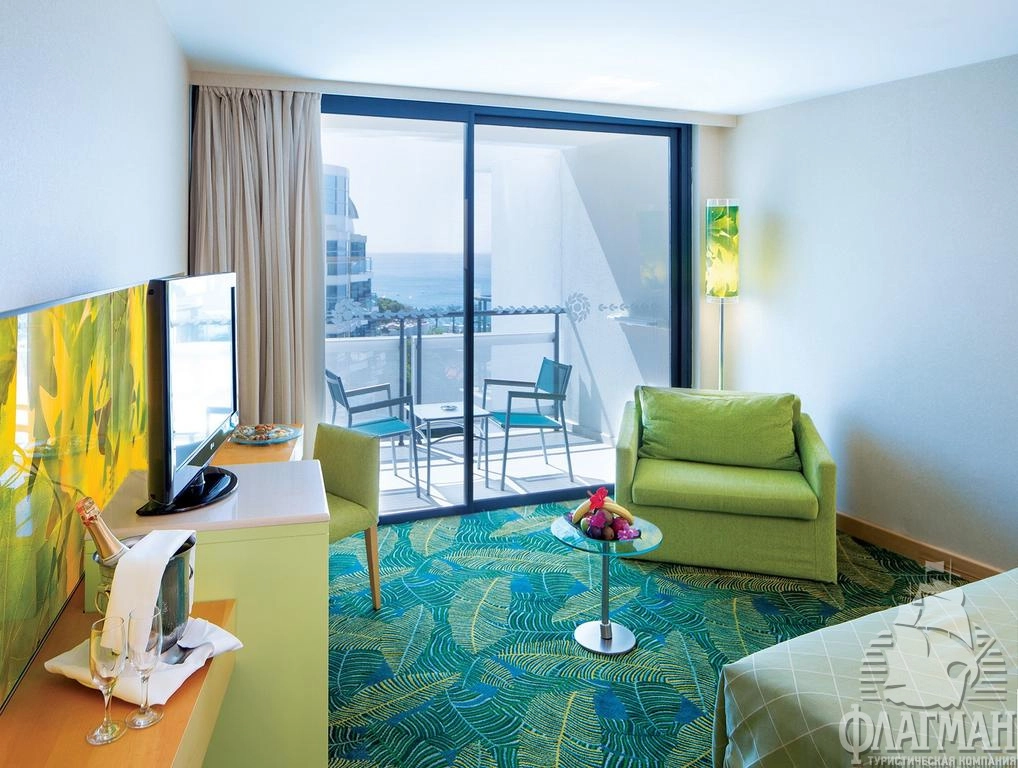 2 двухкомнатных grand deluxe suite (вид на море, гостиная, спальня с дверью, ванная с ванной и душем, джакузи на террасе, 2 ТВ, 2 террасы, ежедневно фрукты, шампанское и цветы в номере, полный мини-бар, включая местные и импортные напитки, услуги прачечной – бесплатно, макс. 4 чел., 120 м2).